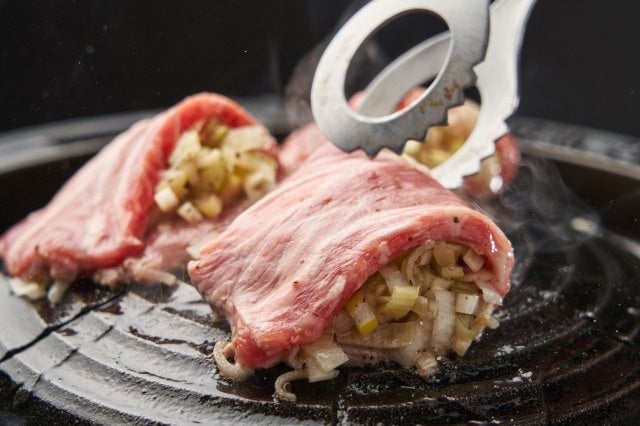 ありそうでなかったねぎまみれジンギスカン!ネギを包んで蒸し焼きに!胡麻油と塩の鉄板の組み合わせ。豆板醤をつけるとより美味です。