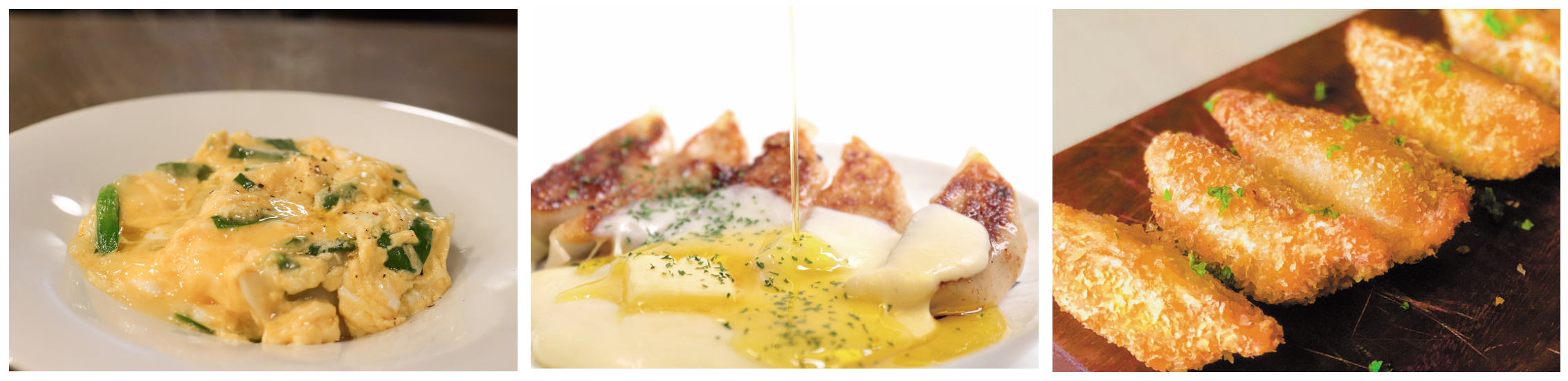エビ蒸し餃子に、ニラ玉チーズをたっぷりかけた【泡ギョーザ FUNHOLiC】の「ふわふわとろとろニラ玉チーズ餃子」は、生クリームとチーズの入ったフワフワたまごが餃子を包みます。肉汁たっぷりのアツアツの焼き餃子にチーズとバターをたっぷりのせて、トリュフオイルで仕上げる「バターチーズに溺れた餃子 トリュフオイル添え」は【ガチンコラーメン道 柊】から。北海道・十勝産豊西牛と、2種類のバターと味噌を使用した餡を包んだ皮に衣をつけて揚げた【餃子とワイン 果皮と餡】の「十勝産濃厚味噌バター牛カツ餃子」は、イタリアンのシェフが考案した唯一無二の揚げ餃子。