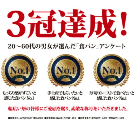 20〜60代の男女に対する食パンアンケートでも、3冠を獲得。