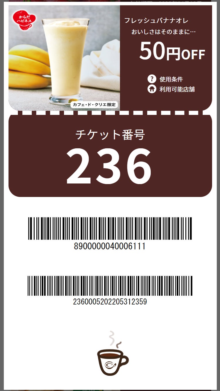 例:「フレッシュバナナオレ〜バナナまるごと1本〜」と「フレッシュバナナのグリーンスムージー〜ほうれん草&アボカド〜」をご注文の場合はそれぞれのクーポンをご利用いただけます。