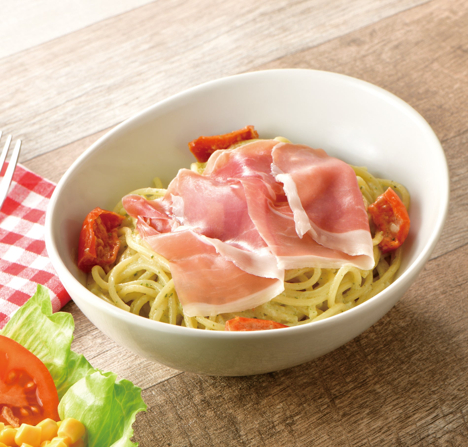 ■「パスタ イタリア産生ハムのバジルクリーム」※糖質50%OFFのフェットチーネ麺に変更
