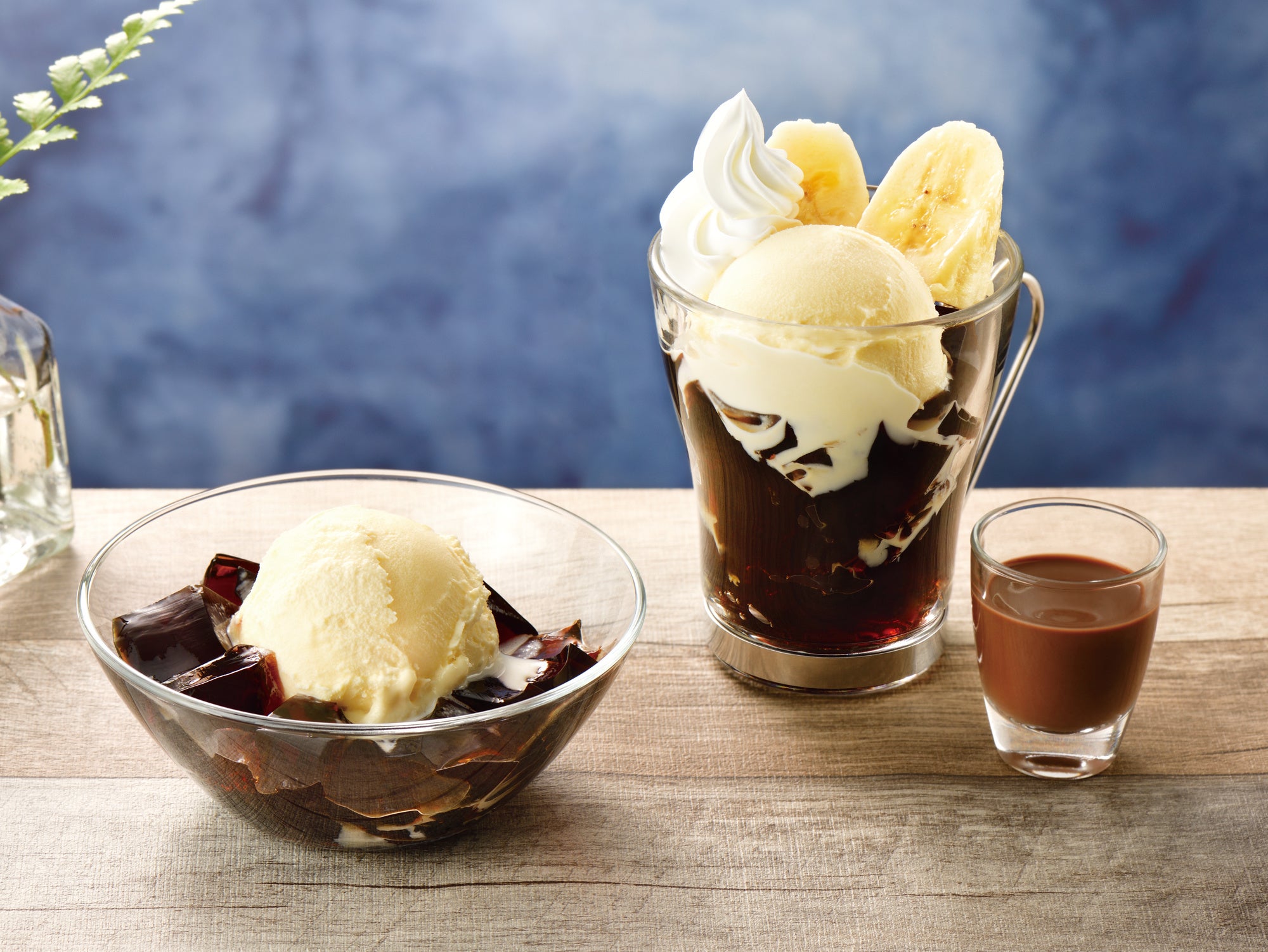 デザートメニュー「自家製珈琲ゼリー」は、各店舗で抽出した香り高くすっきりとしたアイスコーヒーを使用し、オリジナルの珈琲ゼリーに仕上げました。バニラアイスとの相性も良く、暖かくなる季節にぴったりのひんやりデザートです。