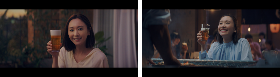 今回のTVCMは、外でビールを飲みたくなるような温かい春の風を感じる夕刻に、新垣さんがテラスで一息ついているシーンから始まります。テラスでビールを手に取り、馴染みの焼鳥屋のカウンターで店主と談笑しながらビールを飲んでいるシーンなどを思い出す様子を描いています。春らしい髪型にイメージチェンジした新垣さんがカメラ目線で「日本のみなさん、おつかれ生です」と語りかける様子やビールを飲んだ後のホッと落ち着いた表情を通じて“ぬくもりのある世界観”を演出し、認知拡大と飲用喚起を図ります。