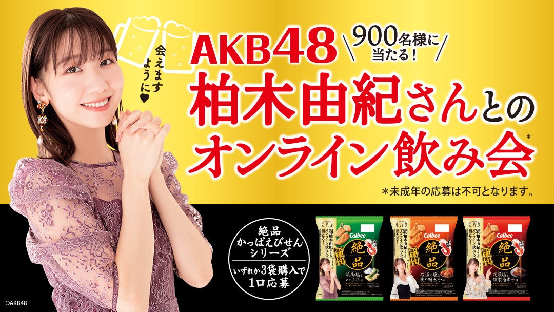 対象商品の「絶品かっぱえびせん」を3袋購入して、「カルビー ルビープログラム」にて応募すると、幅広い人気を誇るAKB48の柏木由紀さんとのオンライン飲み会が、900名様に当たるキャンペーンを実施します。