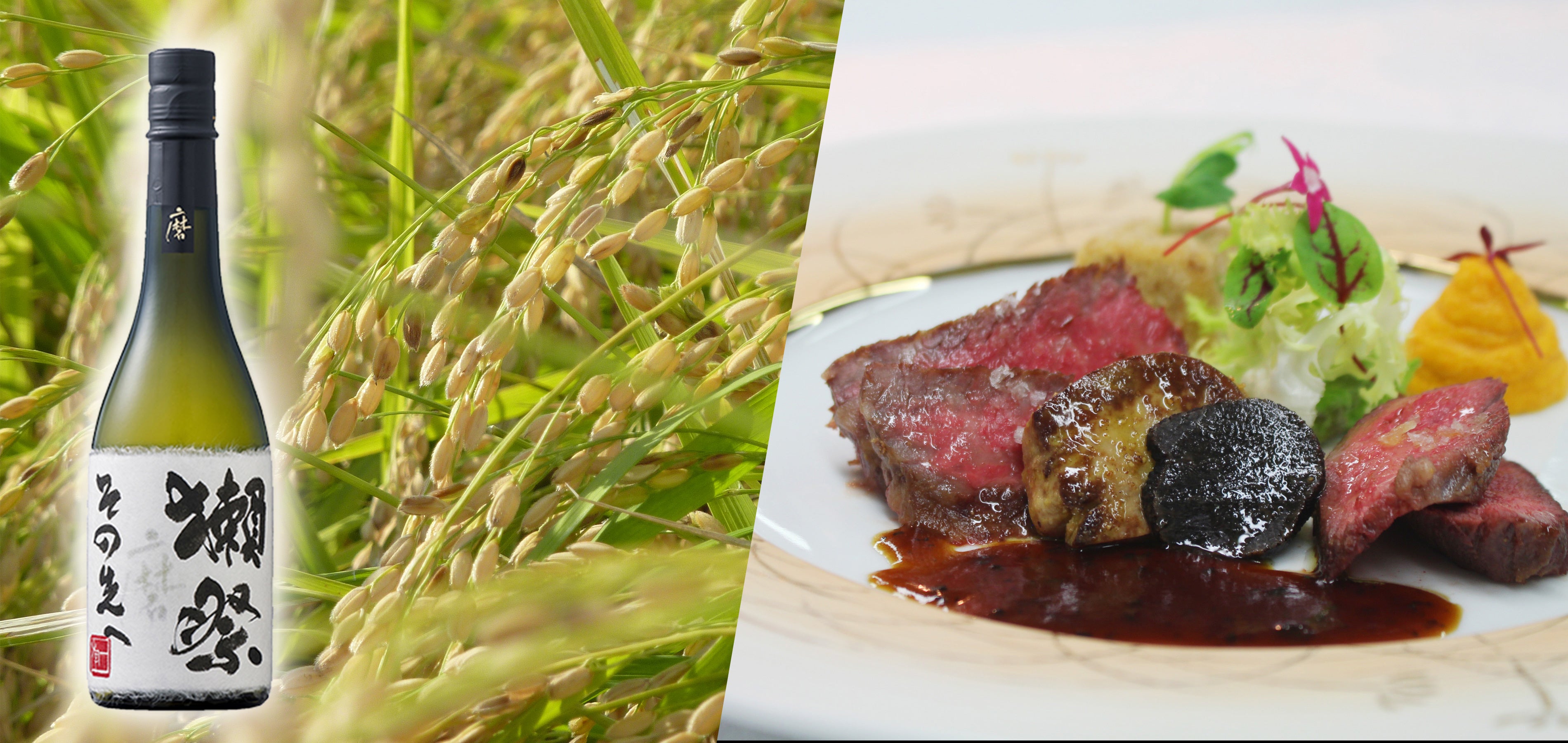 佐藤は「酔うため、売るための酒ではなく、味わう酒を」をスローガンにした獺祭こだわりの酒造りを体験することで、酒造りに真摯な姿勢で取り組む職人を間近で見ることで、伝統を受け継ぎながら常に最高を追い求める料理人の想いと通じるものがあることに思いを馳せ、こだわりのフランス料理を創り上げました。メインディッシュには獺祭の酒粕と山田錦の米粉で育まれた希少銘柄「高森和牛」の逸品を用意するとともに、食中に召し上がるパンにも酒粕と米粉をそれぞれ使用いたしました。食後のデザートには、刻んだ生姜と獺祭を使用したガトーショコラもお楽しみいただけます。お飲物ではシェフソムリエをはじめソムリエ・唎酒師によって選定された獺祭スパークリングのほか、低アルコールの「獺祭 美酔」、等外米を使用した「獺祭 未来へ 農家と共に」、“獺祭磨き二割三分”を超えるものとして造られた旭酒造最高の技術や知識を詰め込んだ「獺祭 磨きその先へ」など数量限定銘柄をご用意し、料理とのマリアージュを存分にお楽しみいただけます。