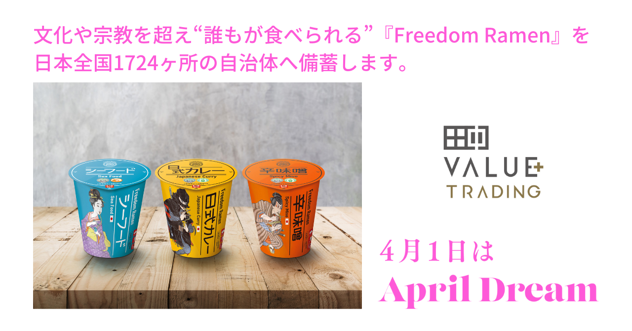 この『Freedom Ramen』を、日本全国1724カ所の自治体に備蓄し、日本で災害が起きて避難所へ行った際に、国境や文化や価値観などの理由で食べたいけど食べることができるものがないという人たちの元にお届けします。