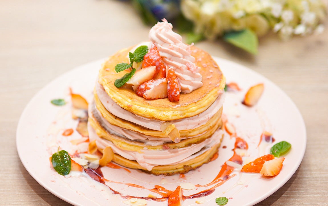 ふわふわのパンケーキに、フレッシュな苺と、たっぷりのいちごのホイップクリームが入った春のミルフィーユパンケーキが季節限定販売!