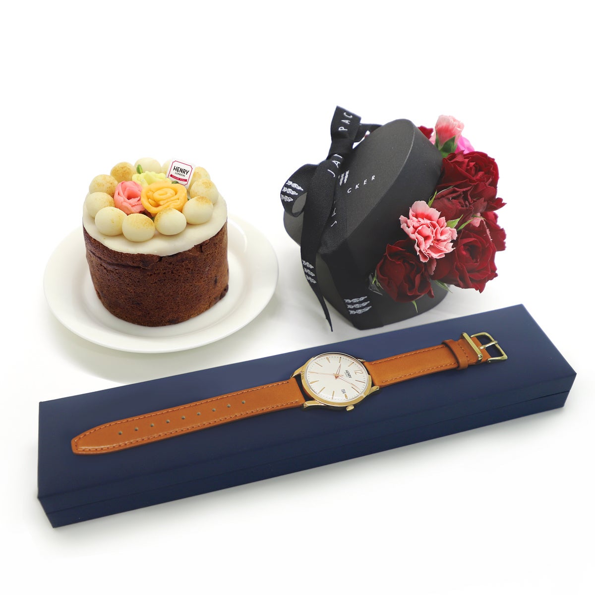 母の日セレクション腕時計4種の中から腕時計をひとつお選びいただき、『ジェーンパッカー×ヘンリーロンドンオリジナルフラワーアレンジメント』と『ベリーズティールーム×ヘンリーロンドンオリジナルシムネルケーキ』をセットにして販売いたします。英国式母の日セットご購入のお客様にはオーガンジーラッピング袋(¥330税込)・刻印サービス(¥3,300税込)を無料でお付けいたします。
