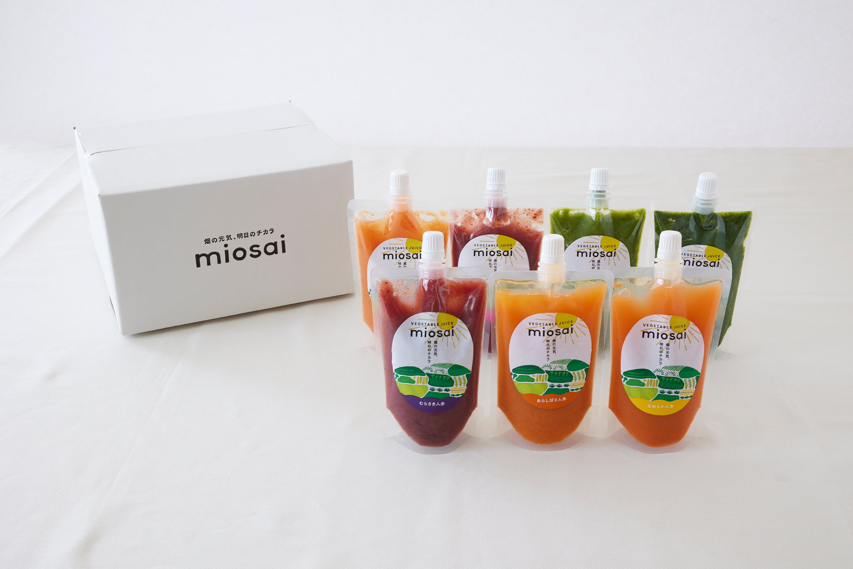 微生物や天敵昆虫による自然の力を利用した栽培方法を導入されている農作物を中心に使用しています。太陽や土の栄養を最大限にジュースに引き出した商品です。ミオサイとは、「ミオ(私の)+サイ(野菜)」の造語で、こだわり農家の私+のむ私+つくる私の3者が元気になることを目的としたブランド名です。