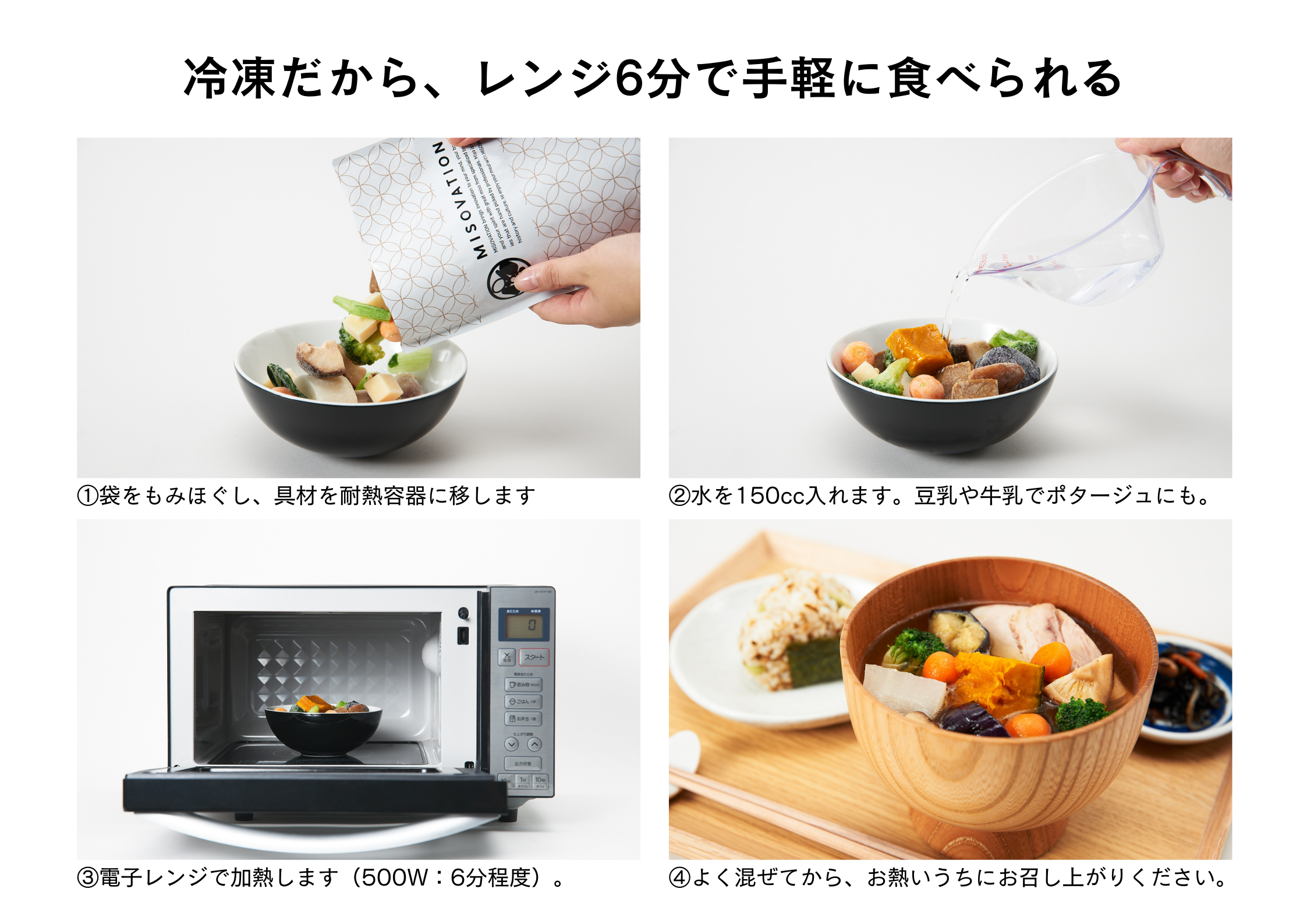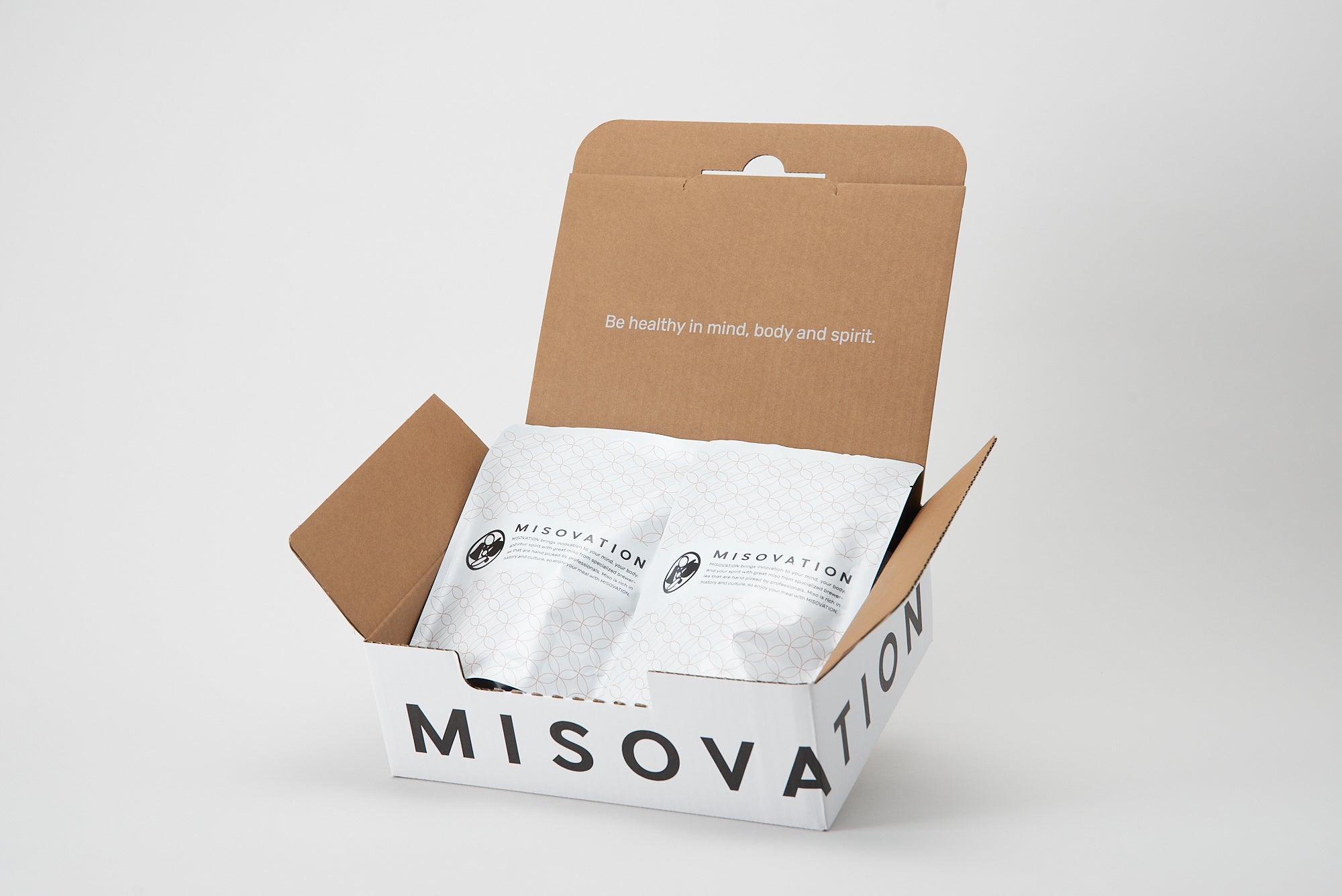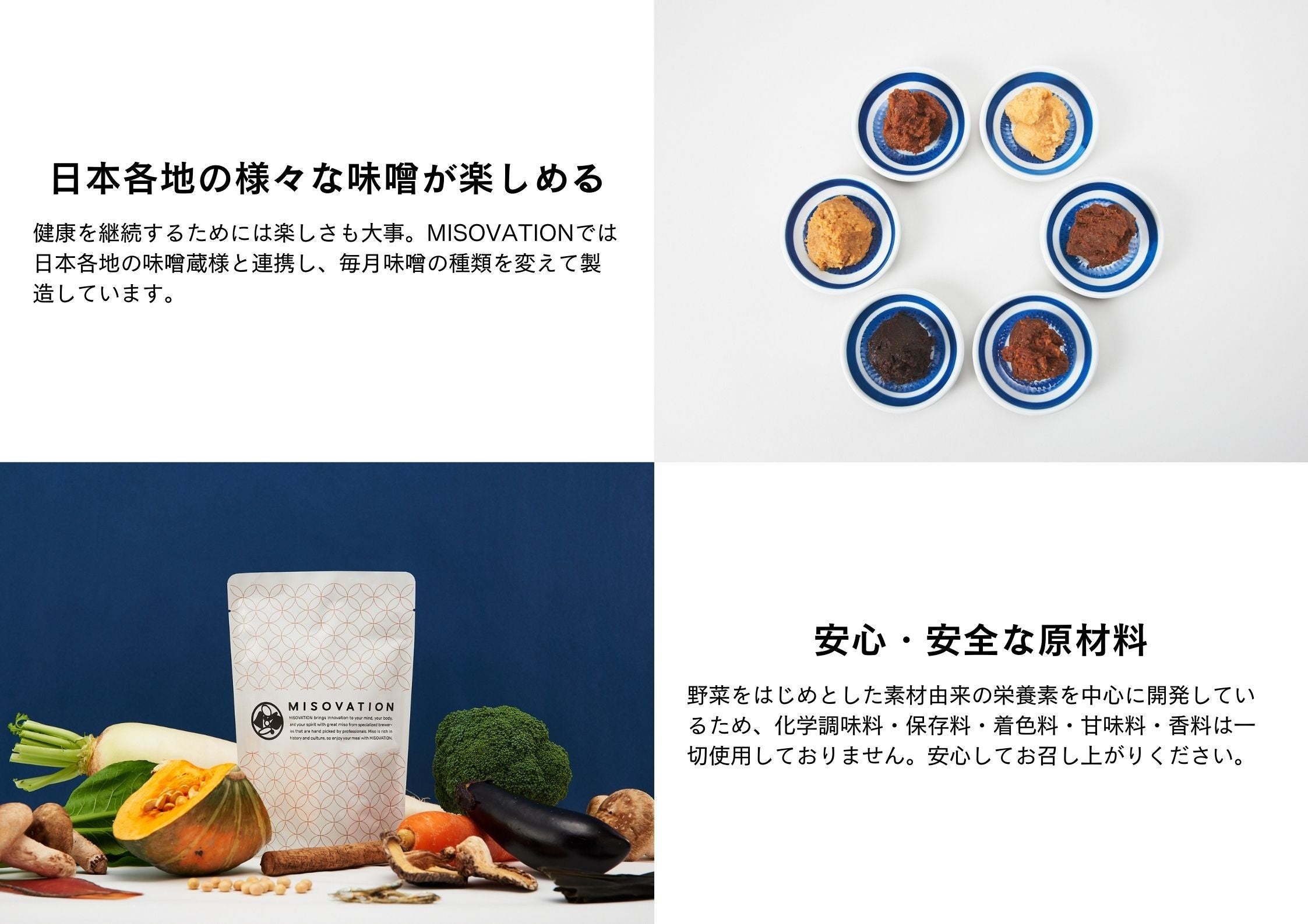 MISOVATIONは栄養士が開発した、完全栄養の味噌汁です。「心を満たす、完全食。」をコンセプトに、簡単に、美味しく、栄養バランスを整えることが出来ます。