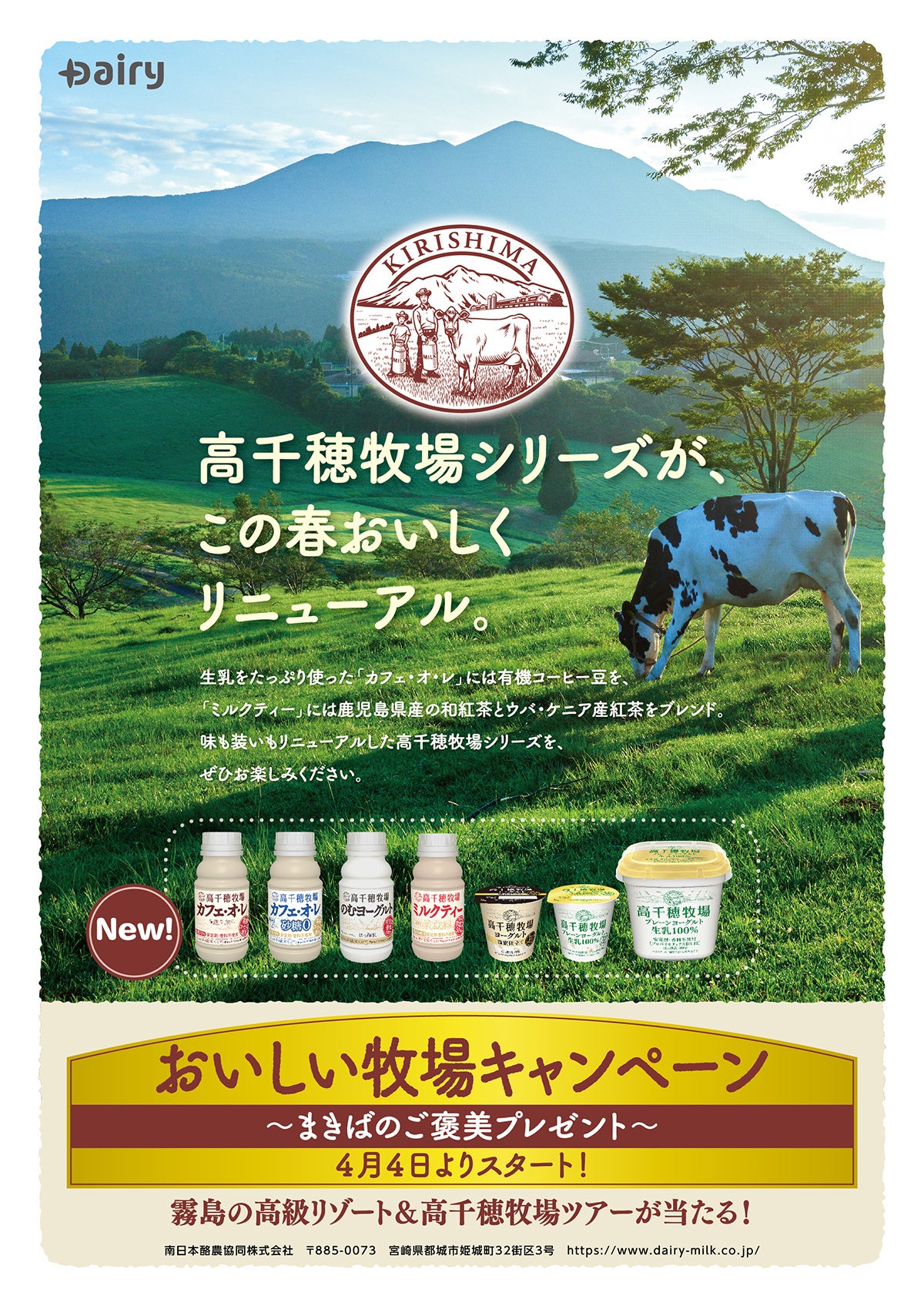 南日本酪農協同株式会社(本社 宮崎県都城市、代表取締役社長 有村 義昭)は、高千穂牧場シリーズのリニューアル・プロモーションとして「おいしい牧場キャンペーン」を4月4日(月)より開催します。