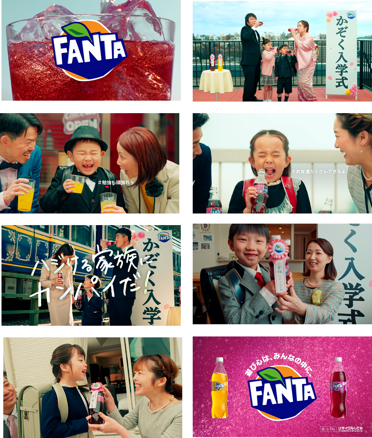 こうした中、家族みんなが笑顔になれる楽しい時間を応援する「ファンタ」は、「せっかくの入学式だから家族全員でハジける笑顔を残したい」という想いを叶えるべく、“かぞく入学式”と題して、ご自宅にて家族だけで行う新一年生お祝いの記念撮影を企画、撮影に参加してくださるご家族をTwitterなどで募集しました。本CMは、その“かぞく入学式”の様子をおさめたもので、新入学のお祝いに「ファンタ」で乾杯する様子や、この日初めて「ファンタ」を飲んだ子どもたちのリアルなリアクションなど、笑顔いっぱい、喜びに満ちた家族のシーンが凝縮されています。