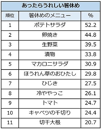 外食をするときの定食などの箸休めの小皿や小鉢について、「基本的に箸休めの小皿や小鉢は必要ない」と答えた人はわずか8.3%で、91.7%の人があったらうれしいと感じるメニューがあることが分かりました。箸休めのなかであったらうれしいもの1位はポテトサラダで52.2%。2位は卵焼き(44.8%)、3位は生野菜(39.5%)という結果になりました。