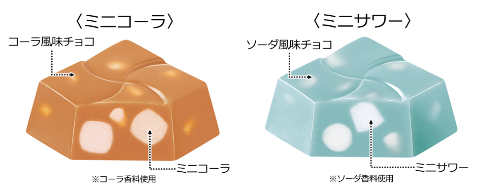 ミニコーラ、ミニサワーのラムネをそのままチロルチョコに入れました。甘くて爽やかなチョコと、食べ応えのあるラムネの組み合わせが特徴です。