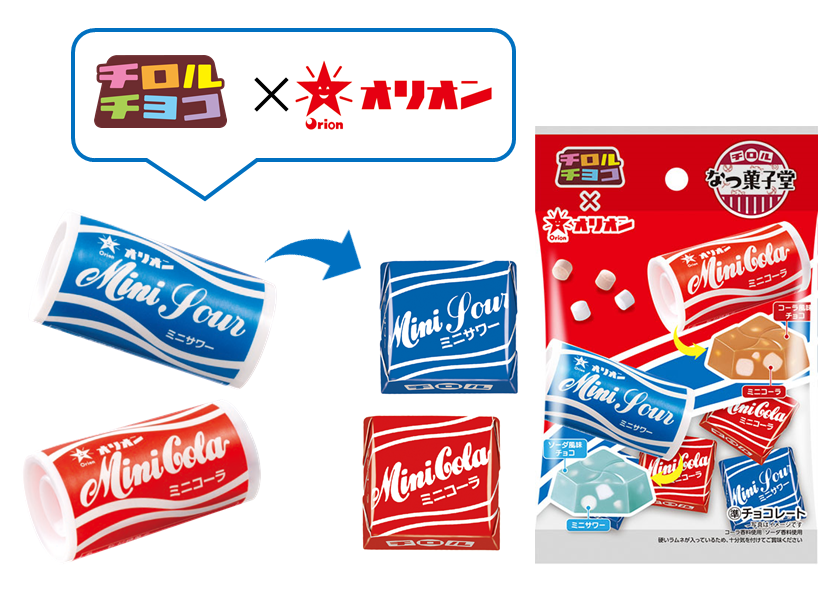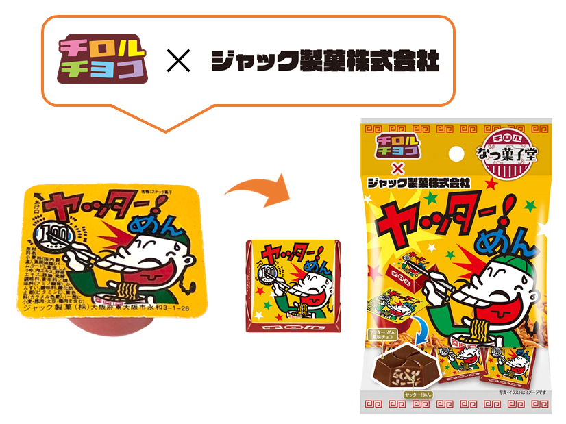 共親製菓、オリオン、ジャック製菓、宮田製菓の1990年代発売ロングセラー駄菓子4品とのコラボ!駄菓子といえば…のおなじみの駄菓子がチロルチョコになって登場します。