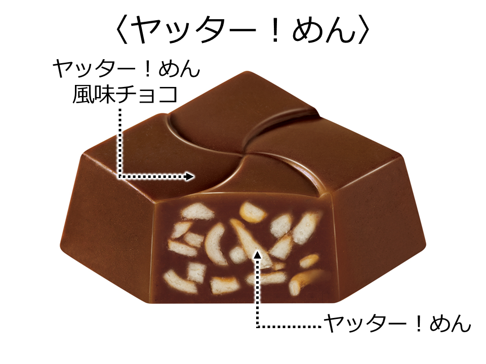 ヤッター!めんそのものを、ヤッター!めん風味のチョコに押し込みました。めんのしょっぱさとチョコの組み合わせがクセになります。