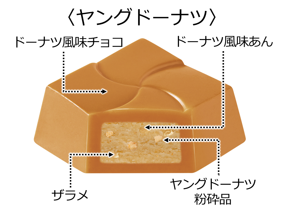 ヤングドーナツの粉砕品とドーナツ風味あんをドーナツ風味チョコで包みました。ザラメが食感のアクセントになっています。