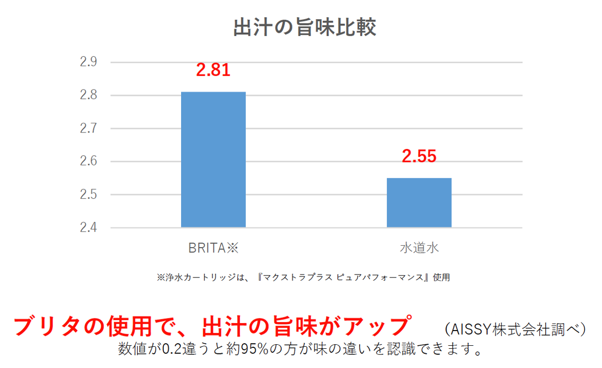 当社は、ブリタの浄水器を料理に活用した際、味にどのくらい差が出るのかを検証しました。その結果、水道水とブリタの浄水カートリッジ『マクストラプラス ピュアパフォーマンス』を比較すると、『マクストラプラス ピュアパフォーマンス』で作った出汁は、旨味が0.26ポイントアップしました。数値が0.2違うと、約95%の方が味の違いを認識することができるため、大多数の方が「ブリタで作った出汁の方が、旨味が強い」ということを感じていただけるでしょう。
