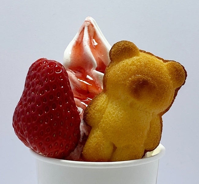 農薬と化学肥料を使わずに育てた牧草と摩周湖の水が岩盤深く浸透し長い歳月を経て地表に現れた“伏流水”を与えることで後味すっきりの切れのある牛乳を生み出しています。今回、この牛乳を使ったコクのある人気のソフトクリームに、甘みの強いいちご「よつぼし」、放牧牛乳を使ったマドレーヌをトッピングしました。