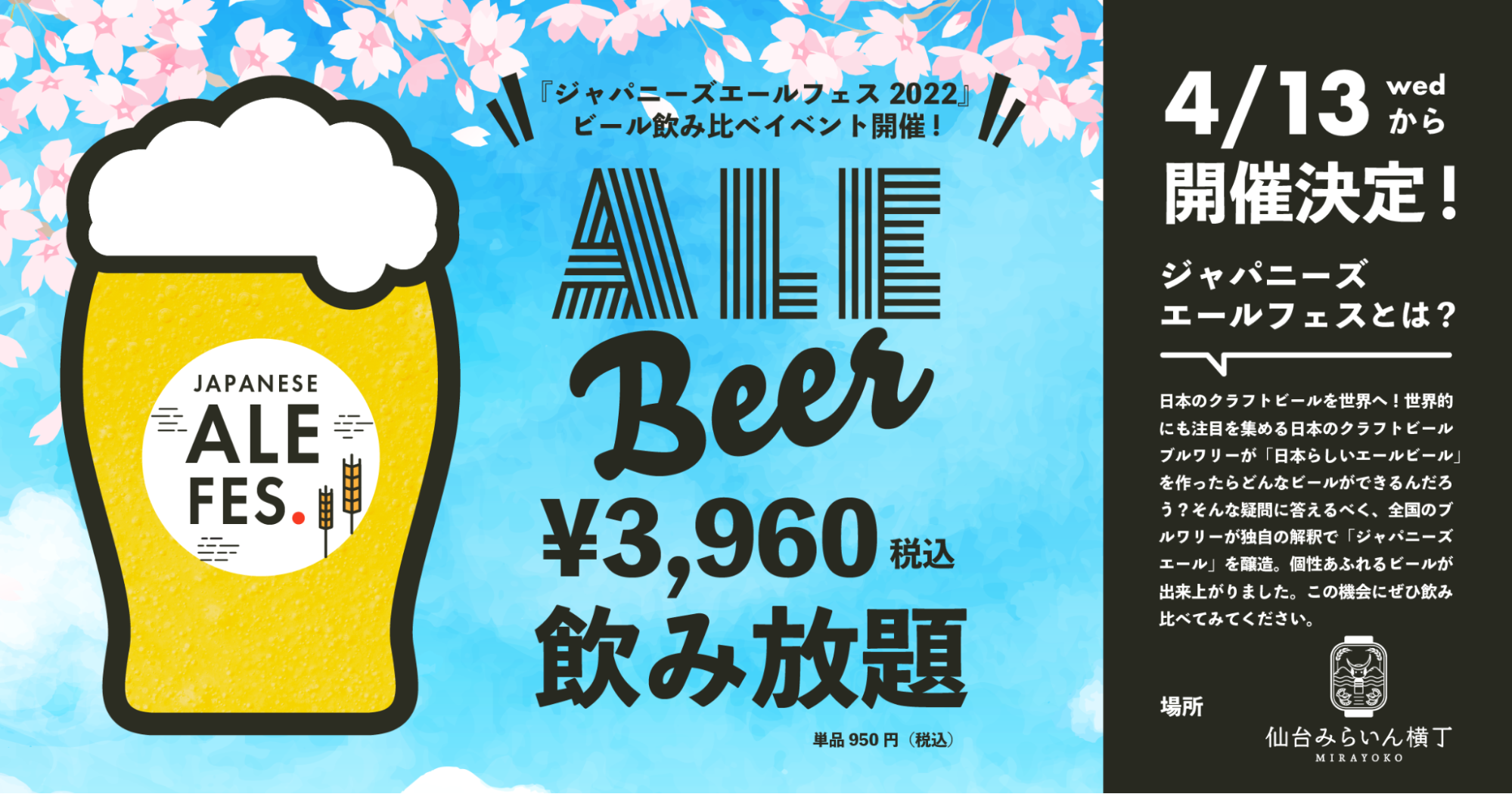 外食DXを推進する株式会社favy(代表取締役社長:高梨 巧、本社:東京都新宿区、以下favy)は、宮城県・仙台「仙台みらいん横丁」にて、クラフトビールの飲み比べイベント「ジャパニーズエールフェス2022」を2022年4月13日〜5月15日の期間限定で開催いたします。
