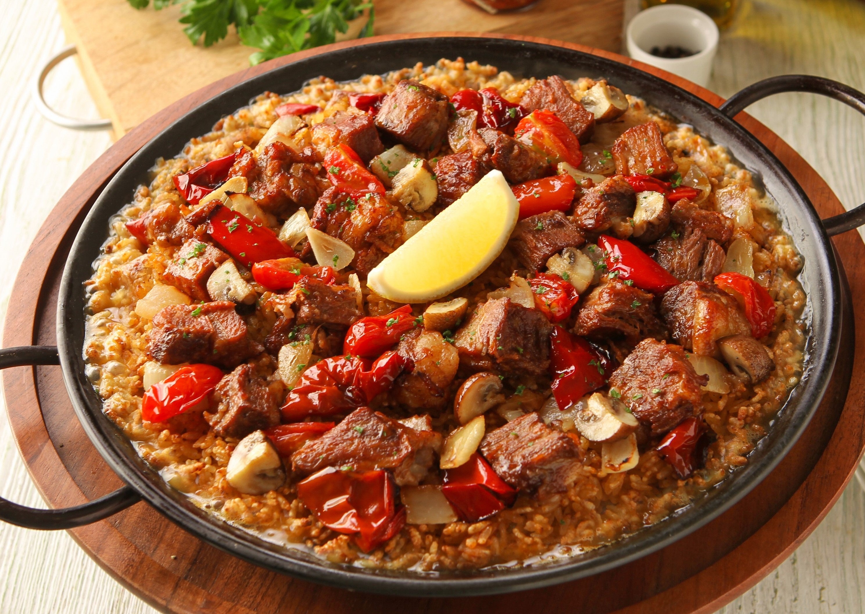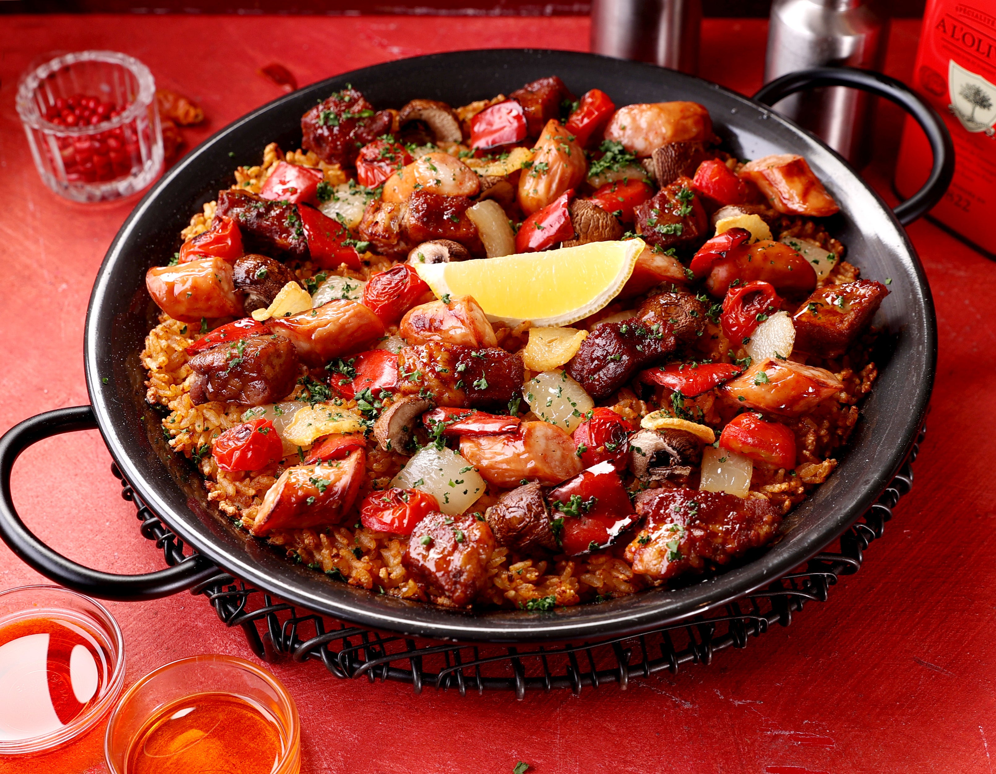 『ステーキとチョリソーの旨辛パエリア』は、ごろっとした大ぶりカットの牛肉と、ピリッと辛みのあるチョリソーをたっぷり使用した、お肉好きの方には一度お試しいただきたいボリューム満点のパエリアです。