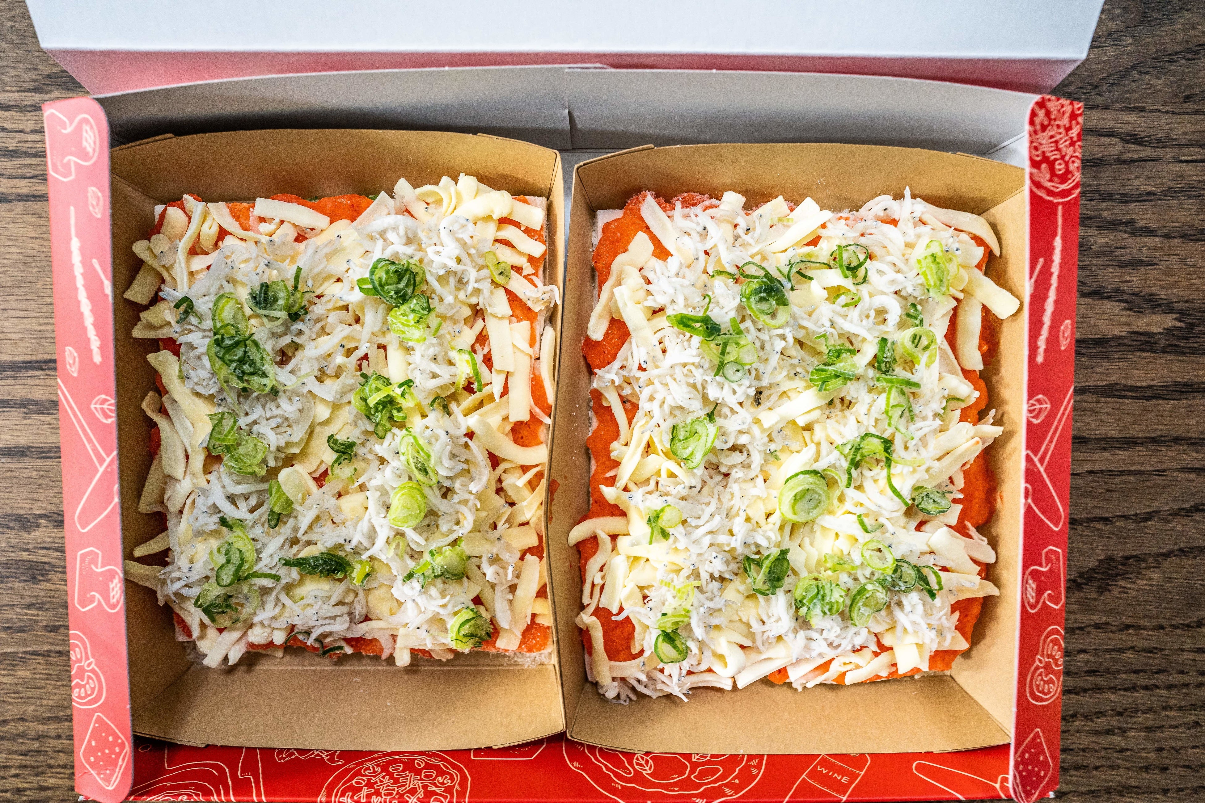 原材料:餅、ナチュラルチーズ(生乳、食塩)、明太ソース(魚卵(まだら、すけとうだら)、食塩、はっ酵調味料、でん粉、しょうちゅう、ワイン、こんぶエキス、酵母エキス、唐辛子、他)、しらす(国産)、青ねぎ/セルロース、調味料(アミノ酸等)、香辛料抽出物(原材料の一部に乳成分、小麦、大豆を含む)