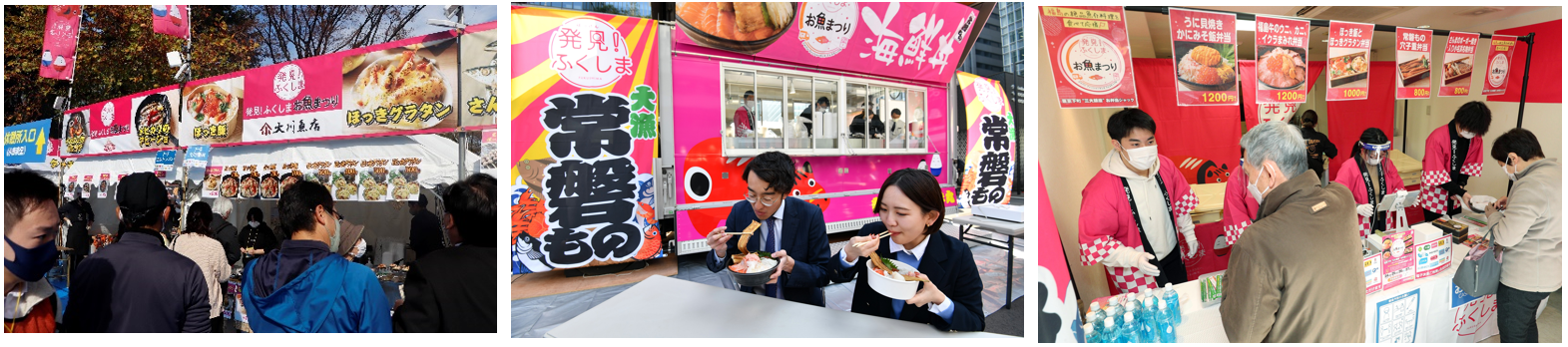 21年11月には日比谷公園において、「第7回ジャパン フィッシャーマンズ フェスティバル」と「発見!ふくしまお魚まつり」を同時開催。入場制限など新型コロナ感染防止策を徹底するなか、3日間で計約6万人が来場しました。今年3月には、巨大キッチンカーが首都圏各所に出動し、旬で新鮮な「常磐もの」を使った海鮮丼を販売する「発見!ふくしまお魚まつり 巨大キッチンカーキャラバン」と、東京の活気ある商店街として〝三大銀座〟と呼ばれる戸越銀座、砂町銀座、十条銀座の各商店街に期間限定店舗を設け、特製弁当を販売する「東京下町〝三大銀座〟お弁当ジャック」を開催しました。