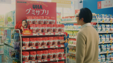 「UHAグミサプリ 亜鉛&マカ」を売るために、吉原店長自らが店頭POPとなります。それを見ているグミサプリファンの男性を、店の端から温かく見守る吉原店長の姿がつい笑いを誘います。