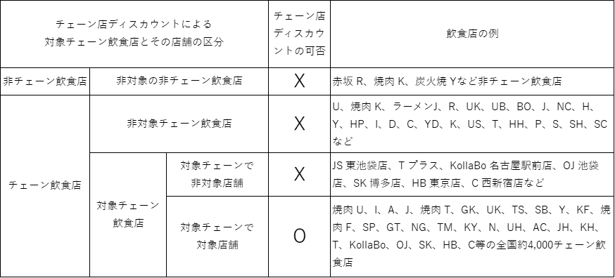 食べログの「飲食チェーン一覧」に掲載されているチェーン店飲食店の名前と、そのチェーン店飲食店が運営する店舗名を確認することによって、どのチェーン店飲食店とその店舗がチェーン店ディスカウントの対象となっているのかを確認することができると考えています。以下の表は、それに基づいて作成したチェーン店ディスカウントの対象と対象でないチェーン店飲食店とその店舗の事例です。(ご迷惑にならないよう、店舗名は匿名で表記)