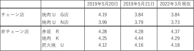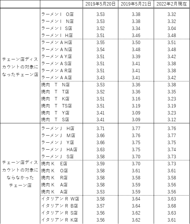 以下の表が示す通り、食べログは、全国約4,000チェーン店飲食店だけを「恣意的」にチェーン店ディスカウントの対象として「差別的」に選び、当該対象チェーン店飲食店の店舗だけの点数を「不当」に下げた可能性が高いです。(過去の点数は、インターネット・アーカイブにより当社が確認)