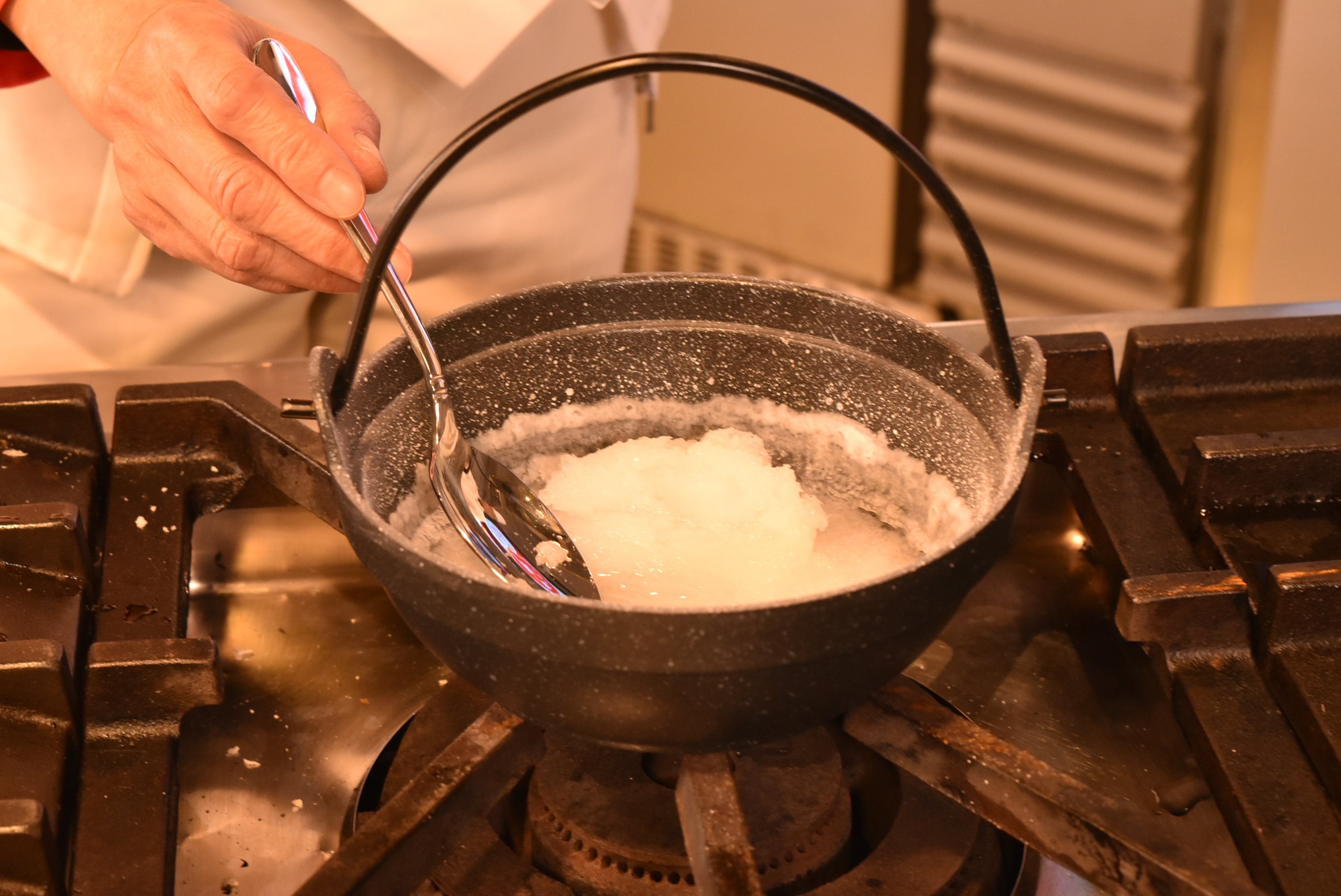また、海水から土鍋で塩をつくるデモンストレーションも行いました。土鍋で時間をかけて海水を煮詰めていくと、塩の結晶がだんだんと大きくなり、キラキラと光る様子に、子どもたちは興味深々の様子でした。また、最後に完成した塩を一枚田先生が味見する場面も。「お塩の甘味を感じる。ミネラルのにがさが、塩の味の奥深さを作り、おいしい。」と感想をいただきました。
