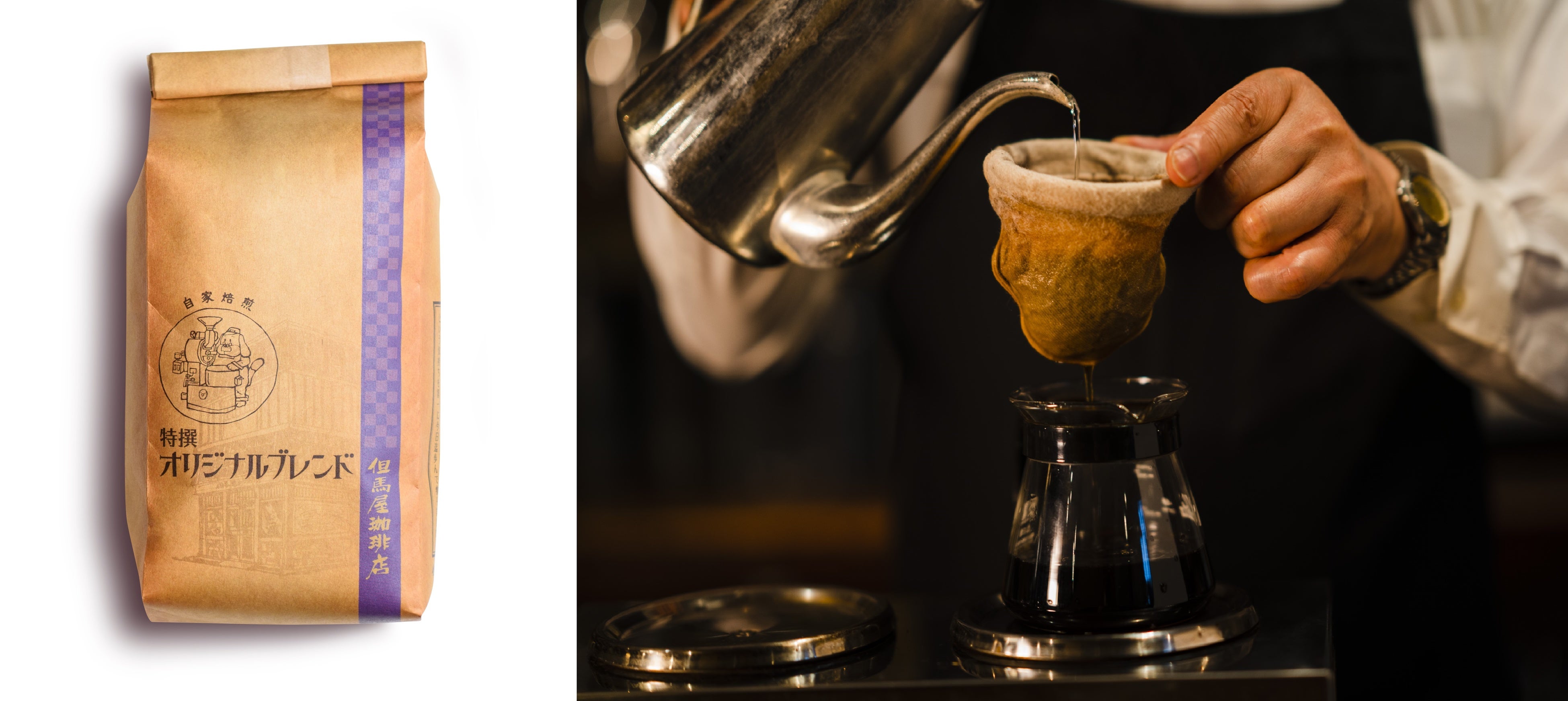30年以上変わらない、但馬屋珈琲店の自慢の逸品。日本各地の珈琲専門店を飲み歩いて研究し、辿り着いたオリジナルブレンドです。コロンビア、ブラジルを中心に4種の異なる産地の豆をそれぞれ焙煎し、各々の特性を引き出してからブレンドする『単品焙煎』にこだわり続けています。4種の珈琲豆がお互いの良さを引き立て合い、ストレート(シングルオリジン)の珈琲では味わえない、豊かなコクと濃厚な苦味、芳醇な香りと甘味を創り出しています。