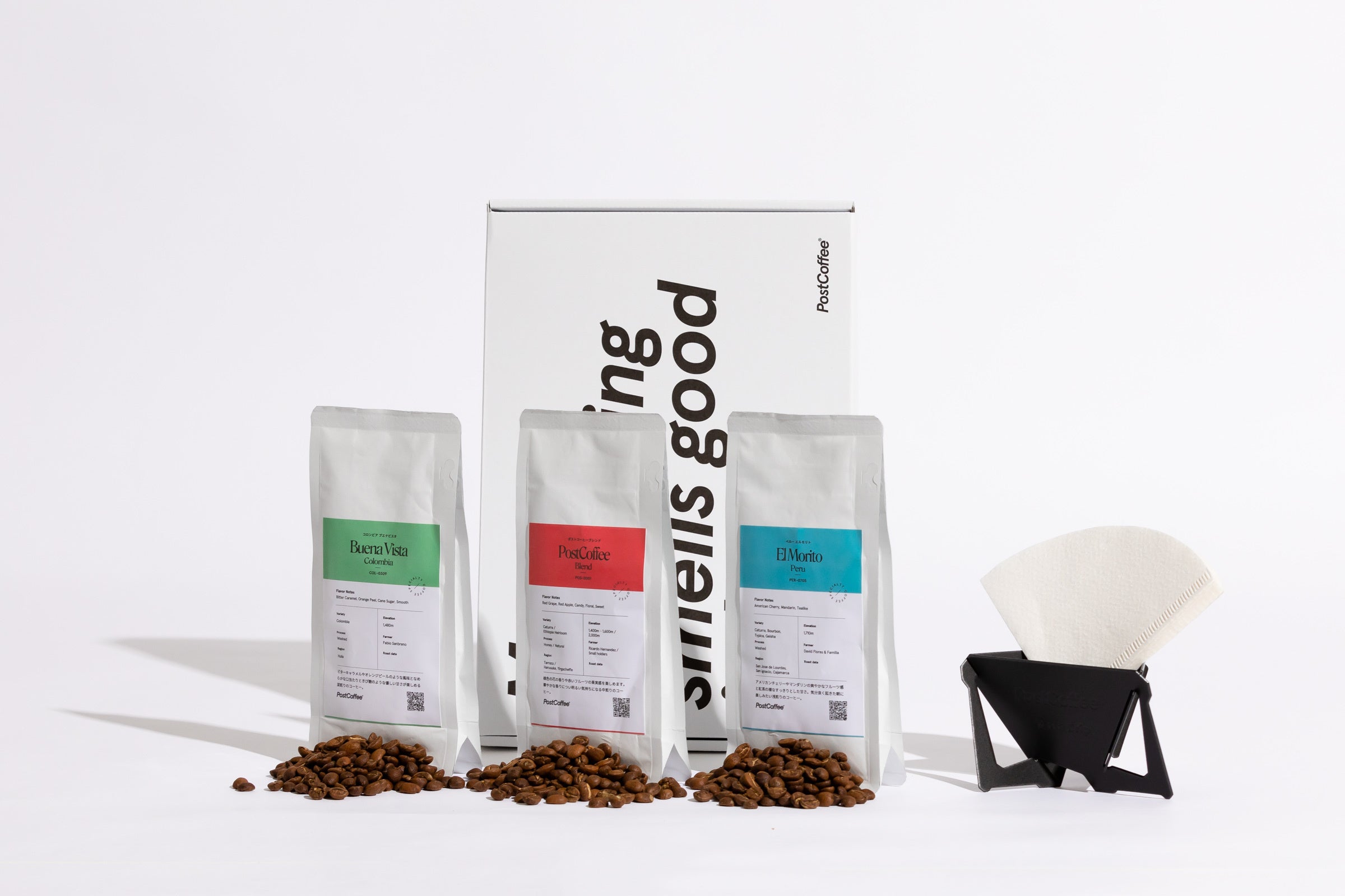 人気のPostCoffeeブレンドに、浅煎りと深煎りのシングルオリジンコーヒーをセットにしました。PostCoffeeのオリジナルドリッパーが付いているので、これからおうちコーヒーを始めたい方にもおすすめです。