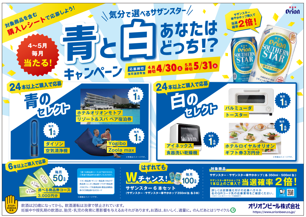 オリオンビール株式会社は、サザンスターのリニューアル及びサザンスター<華やかホップ>の発売を記念し、「気分で選べるサザンスター 青と白あなたはどっち!?キャンペーン」を本日から5月31日まで実施します。