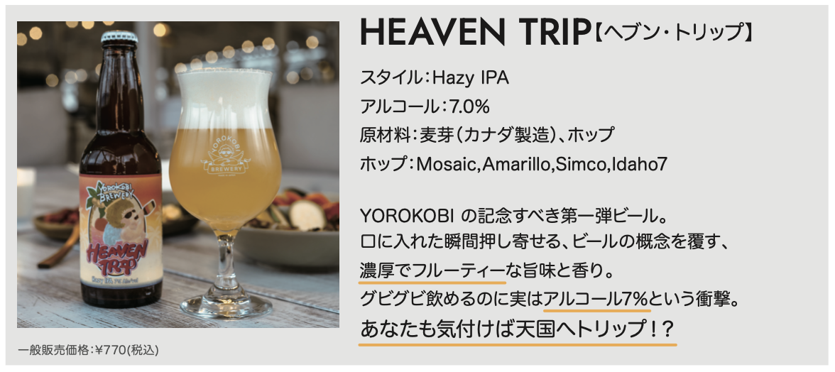 現在、YOROKOBI BREWERYのHEAVEN TRIPは自社EC販売に加え、Amazonでの販売開始準備を行っております。また、東京・渋谷、下北沢を中心とした飲食店やタップルームでのお取扱を急拡大しています。5月以降の販売については、東京・渋谷、下北沢に限らずお取り扱いをいただける、「ビールの喜び」をともに広げるパートナー様を募集しています。