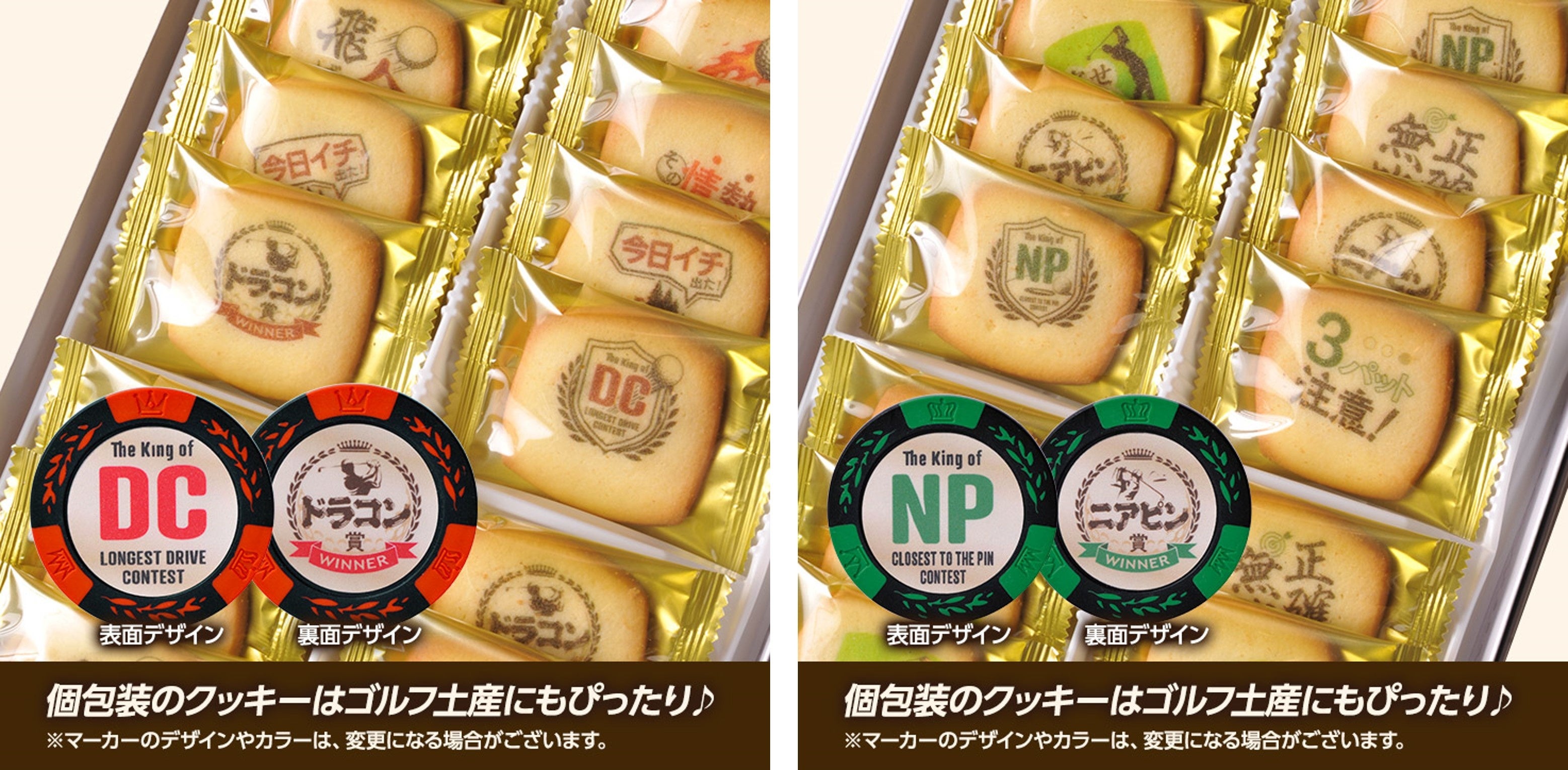従来の商品はクッキーのみでしたが、今回のリニューアルでオリジナルのゴルフマーカーを封入しました。名誉あるニアピン賞・ドラコン賞にちなんだデザインのゴルフマーカーで、次のゴルフも一層楽しんでもらえるはずです。