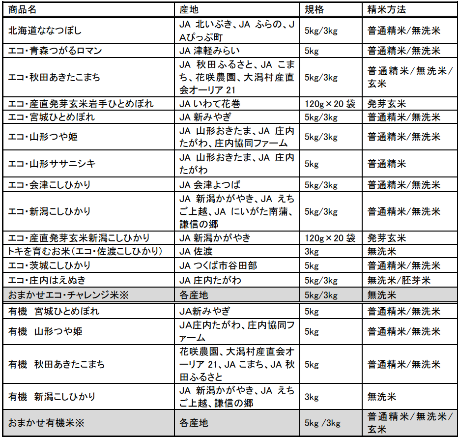エコ・チャレンジ米:化学合成農薬、化学肥料を各都道府県で定められた慣行栽培基準の1/2以下に削減。加えて、パルシステムの「削減目標農薬」の不使用を原則として栽培された米