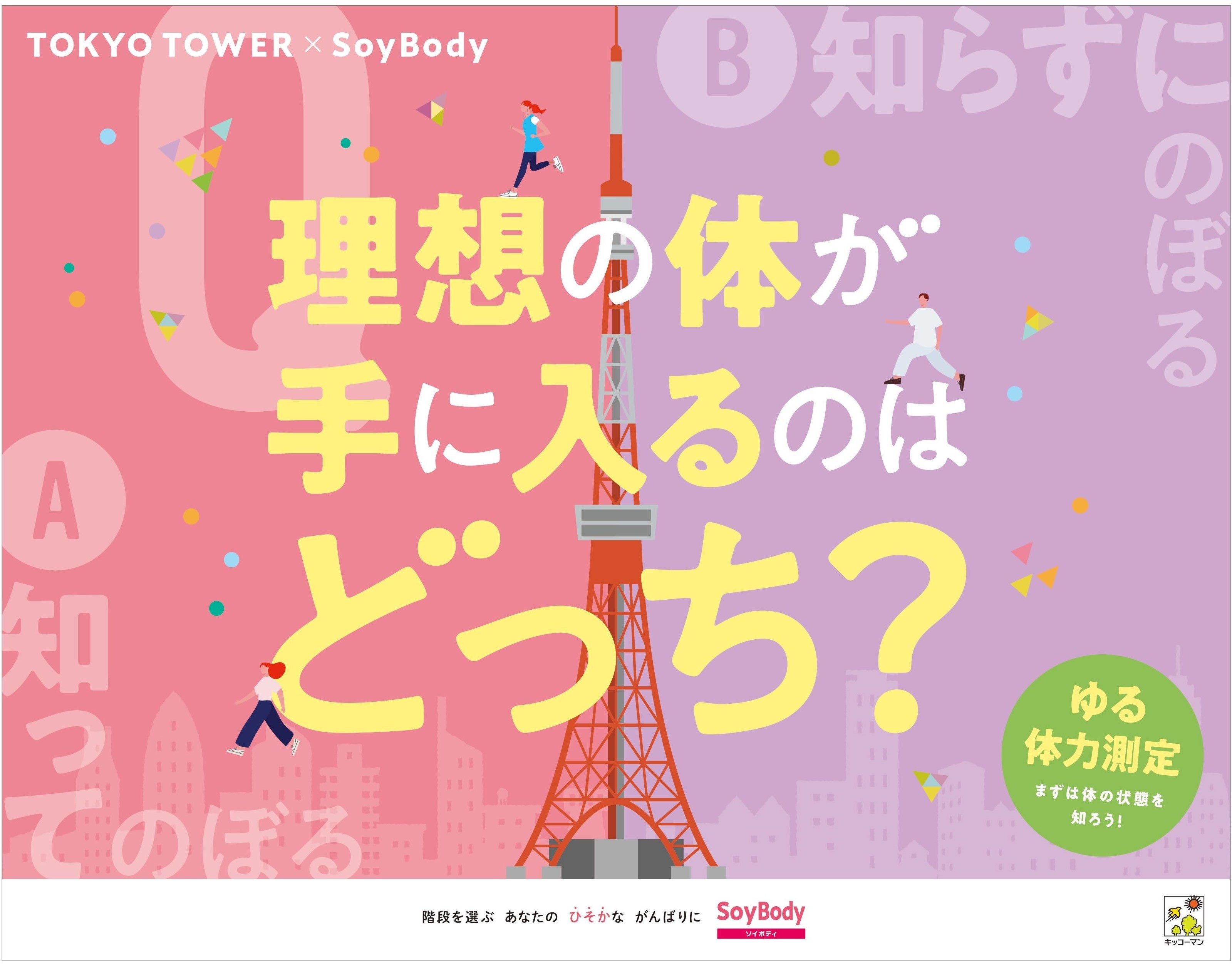 「理想の体が手に入るのはどっち? by SoyBody」は、テレワークや在宅勤務による運動不足が課題となるなか、毎日ひそかに体づくりを頑張る方を応援するためのイベントです。東京タワーのメインデッキを目指して約600段の外階段を登りながら、体づくりについて学べるクイズ型のコンテンツや、ご自身の体の状態を知ることができる「ゆる体力測定チャレンジ」を体験できます。