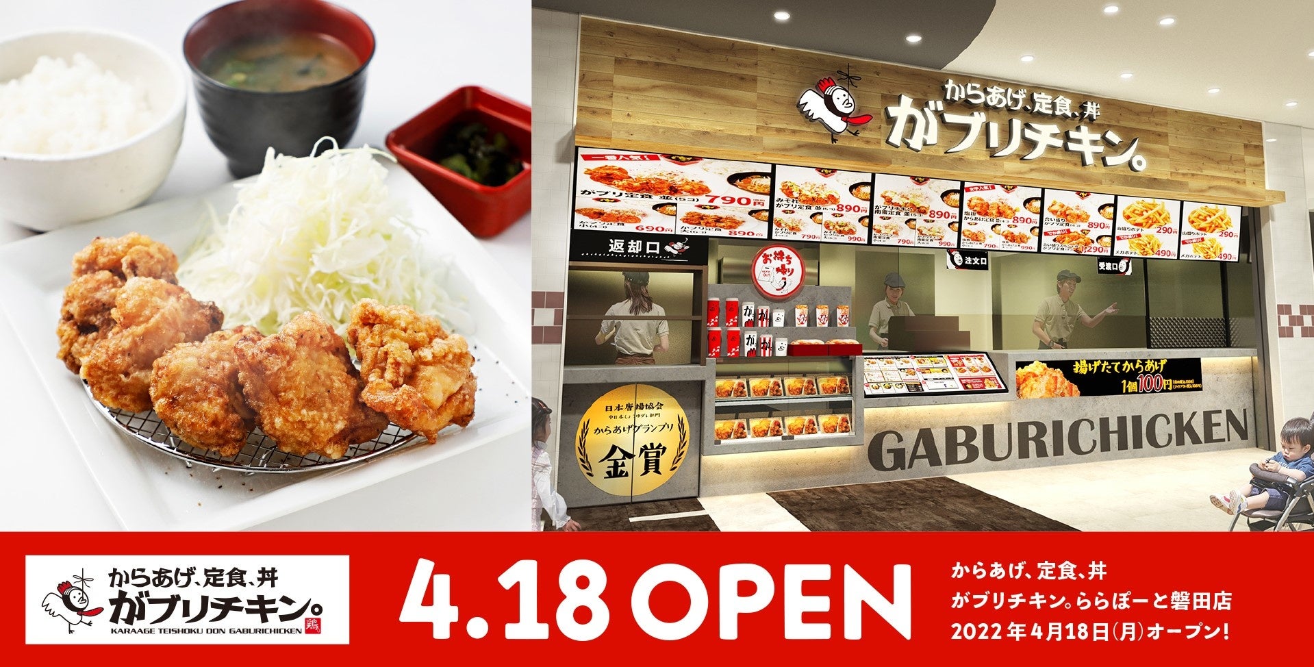 株式会社ブルームダイニングサービス(所在地:名古屋市中村区、代表取締役:杉村 明紀)が運営する飲食ブランド「がブリチキン。」は、新業態「からあげ、定食、丼 がブリチキン。」の静岡初出店となる「ららぽーと磐田店」を、2022年4月18日(月)にグランドオープンいたします。1号店目である「ららぽーと名古屋みなとアクルス店」では、老若男女問わず親しまれており、「がブリチキン。から、定食や丼が出てくれて嬉しい」、「バルや居酒屋と雰囲気が違って、楽しみ方が増えた」などと、大好評をいただいております。