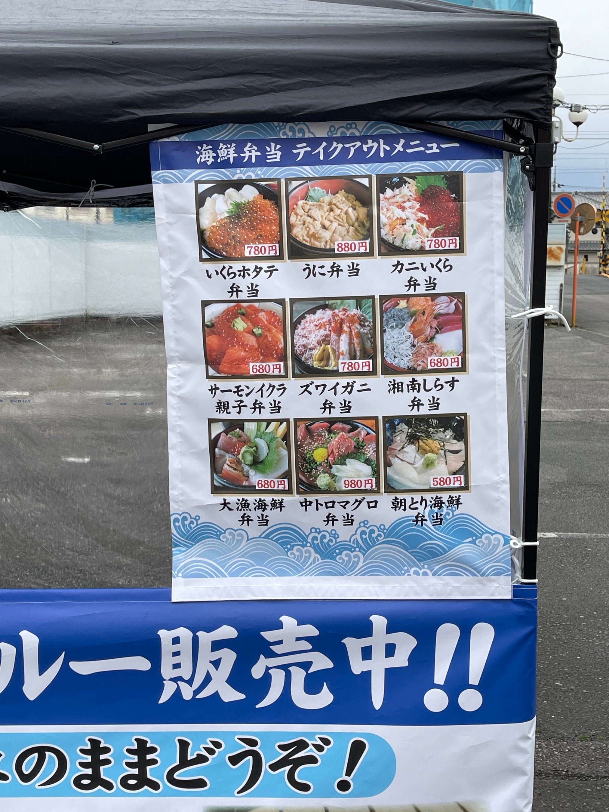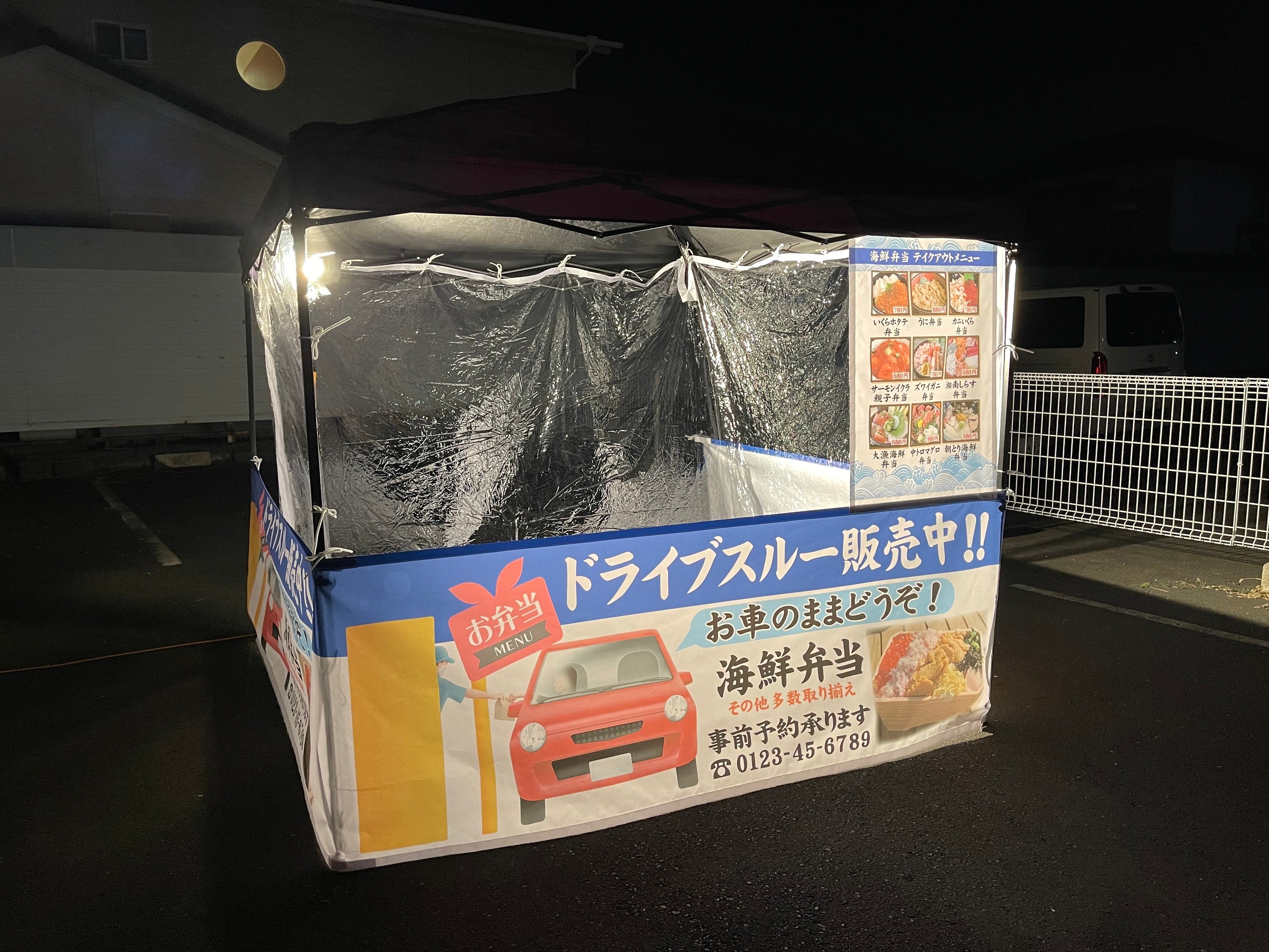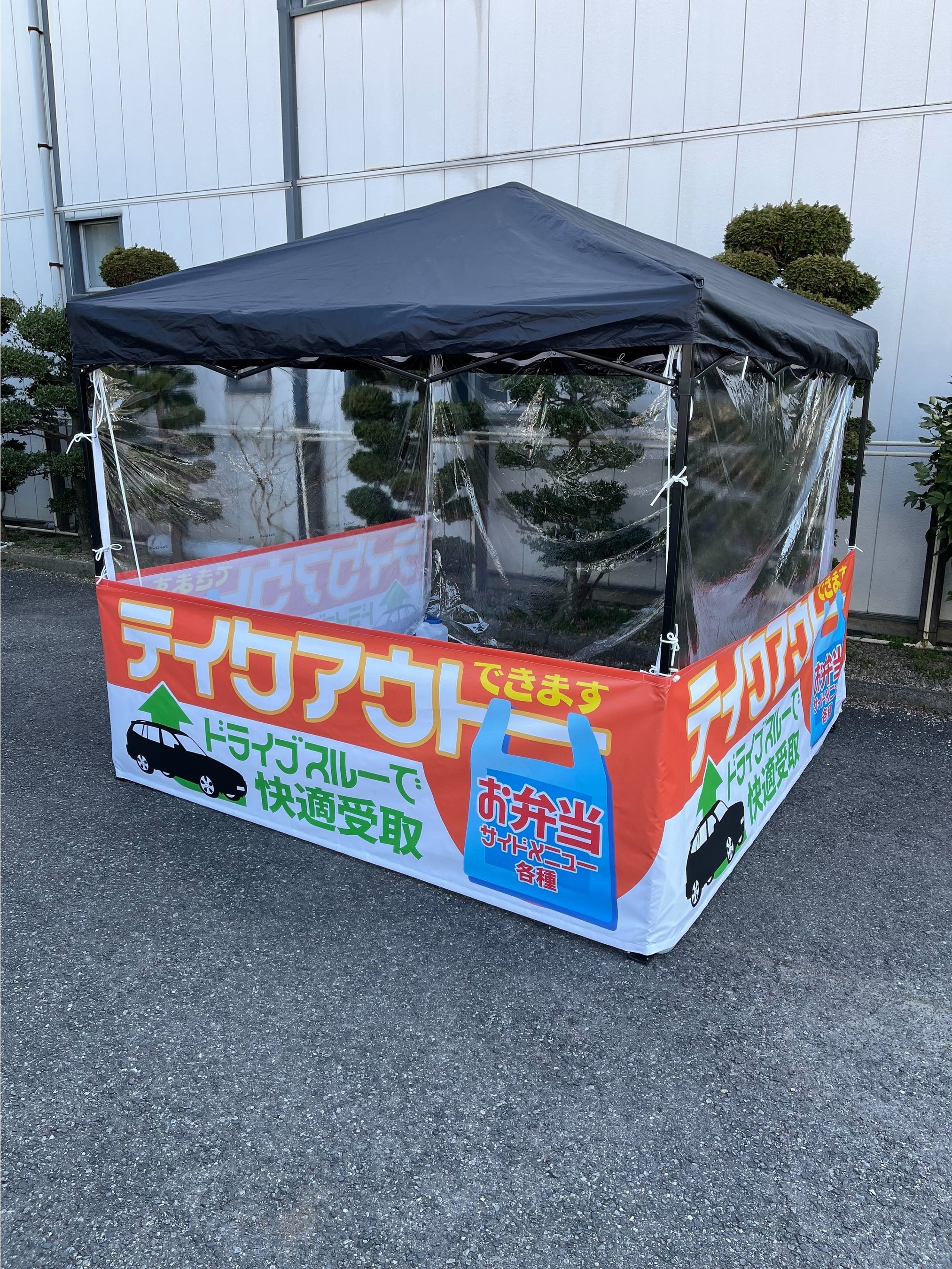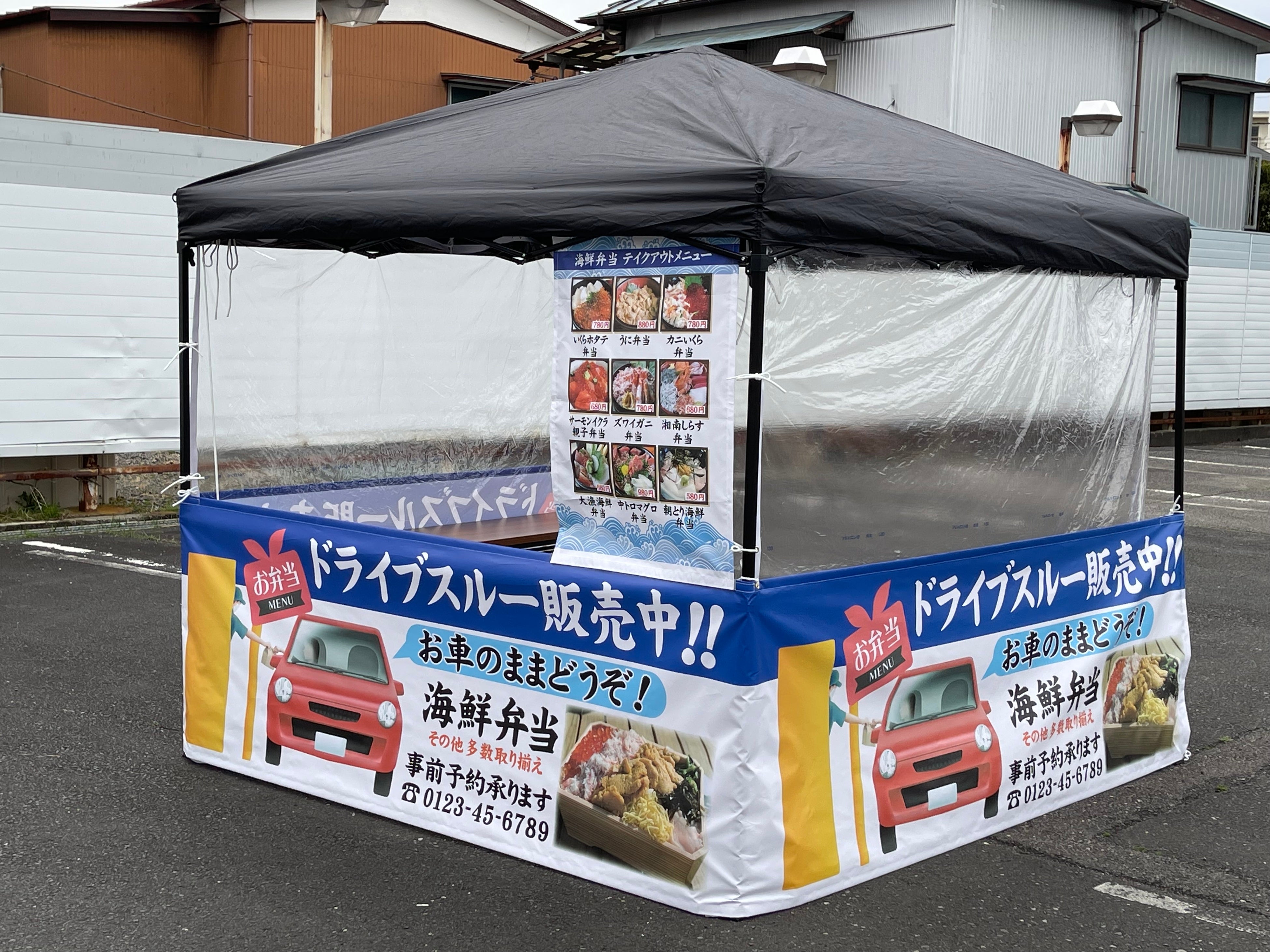 2.5m×2.5mまたは2m×2mのタープテントの3面に看板幕を取り付けます。大型看板のような大きさで ロードサイドの駐車場などに設置します。ランチ弁当やディナー弁当などを ドライブスルーで購入できる事をPRすれば アイキャッチ効果を発揮して お店のランドマーク的な効果を期待できます。