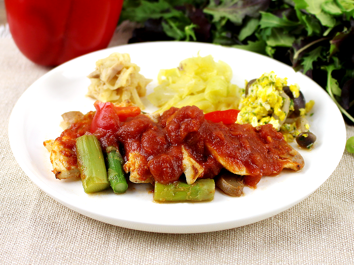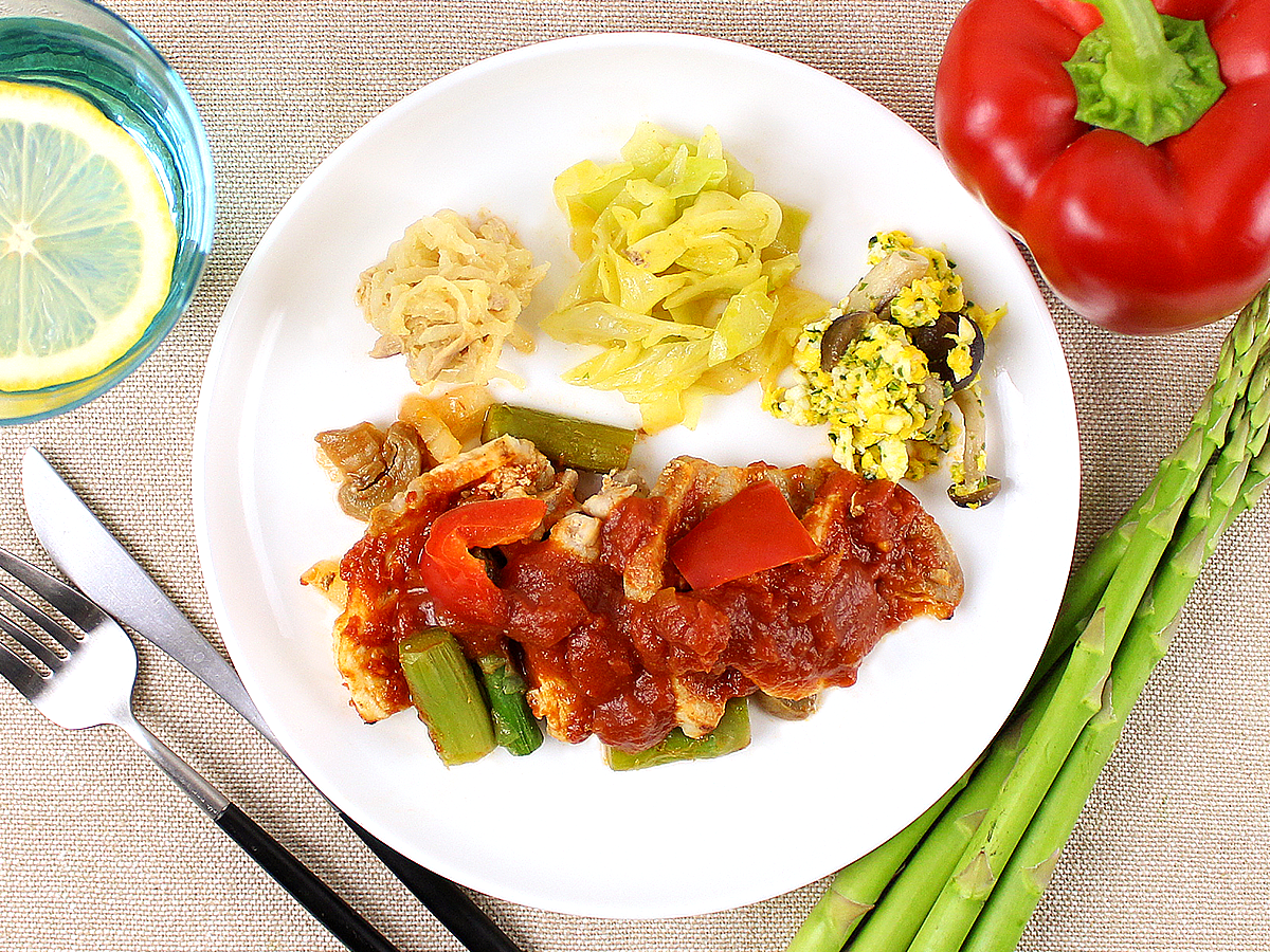 塩麹で優しく下味をつけた豚肩ロース肉を、ポークチャップに仕上げました。コクのある赤ワインソースと爽やかなトマトソースがブレンドされており、キレのある味付けになっています。アスパラ、玉ねぎ、マッシュルーム、パプリカが入っており、野菜もしっかりと食べることができます。懐かしい洋食屋さんを思わせるプレートです。