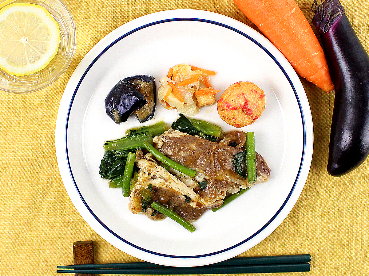 副菜は、揚げなすのソースがけ、白菜と人参の厚揚げ、紅生姜天です。