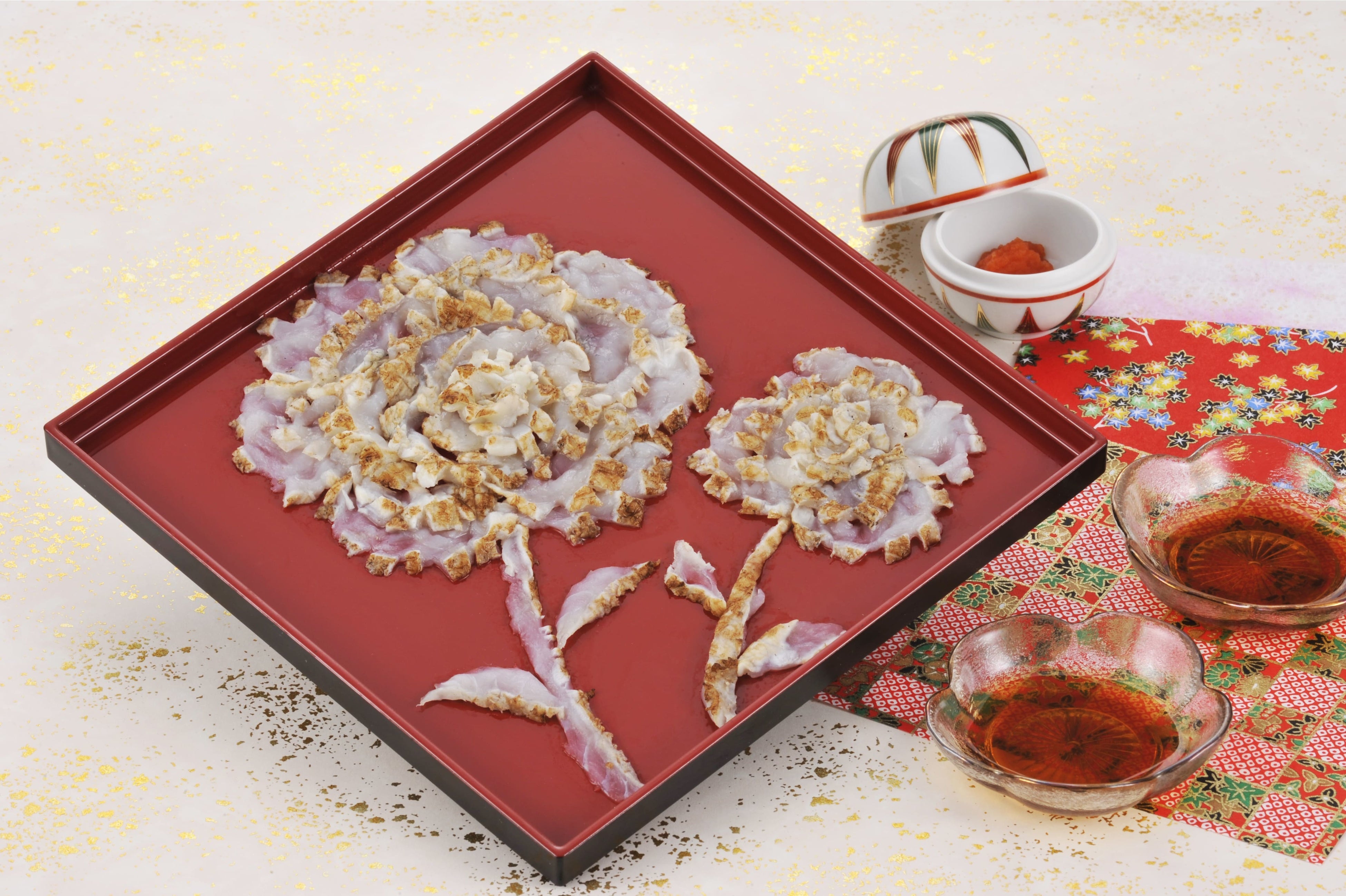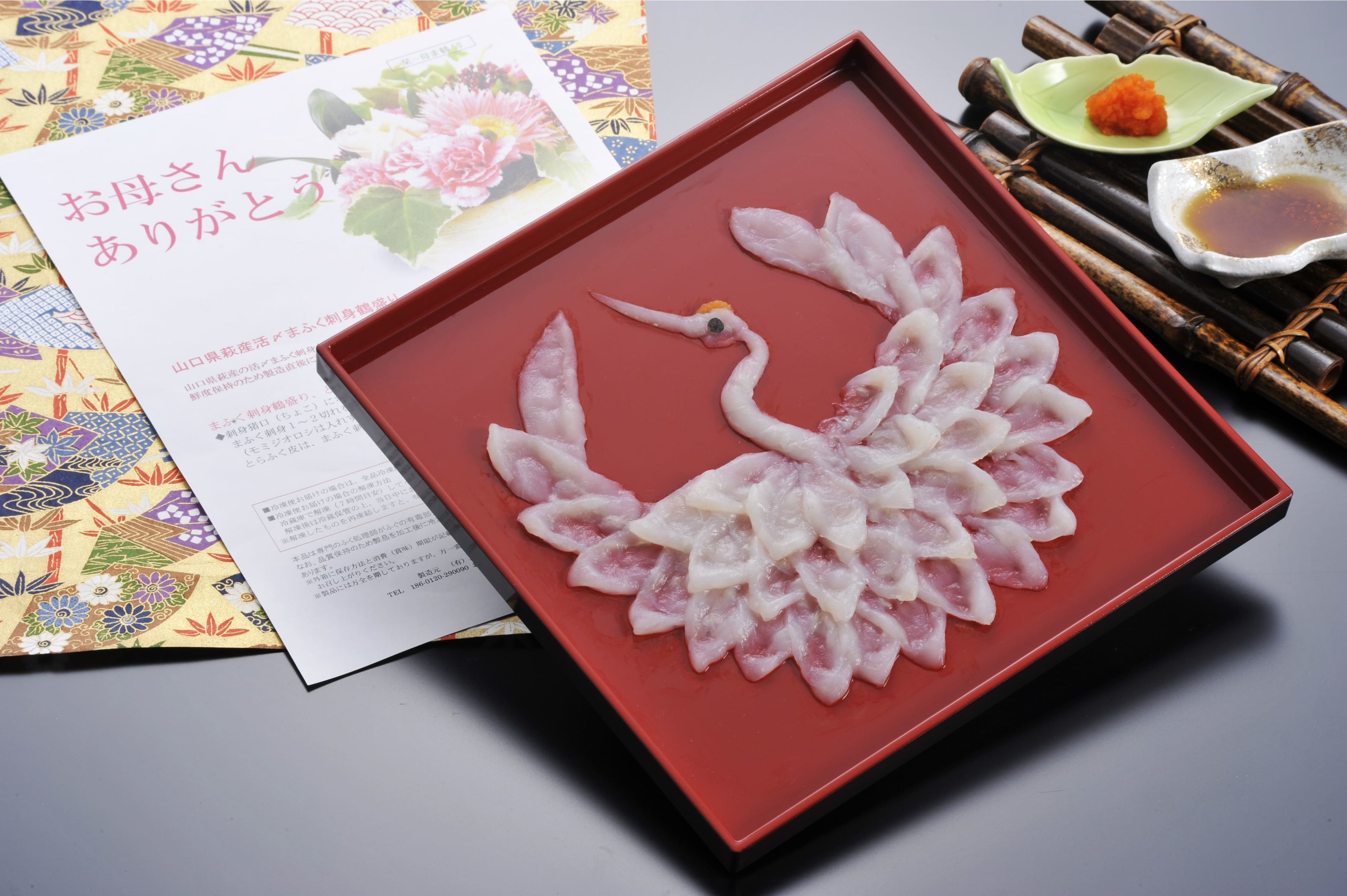 真ふぐの身の表面を強火でサッと炙り、焦げ目を付けた身を職人がカーネーション風に盛りつけた「ふぐ炙り刺身」です。お母さんに見て喜んでもらえるふぐの贈り物で、ふぐの奥深い味わいも楽しんでいただけます。