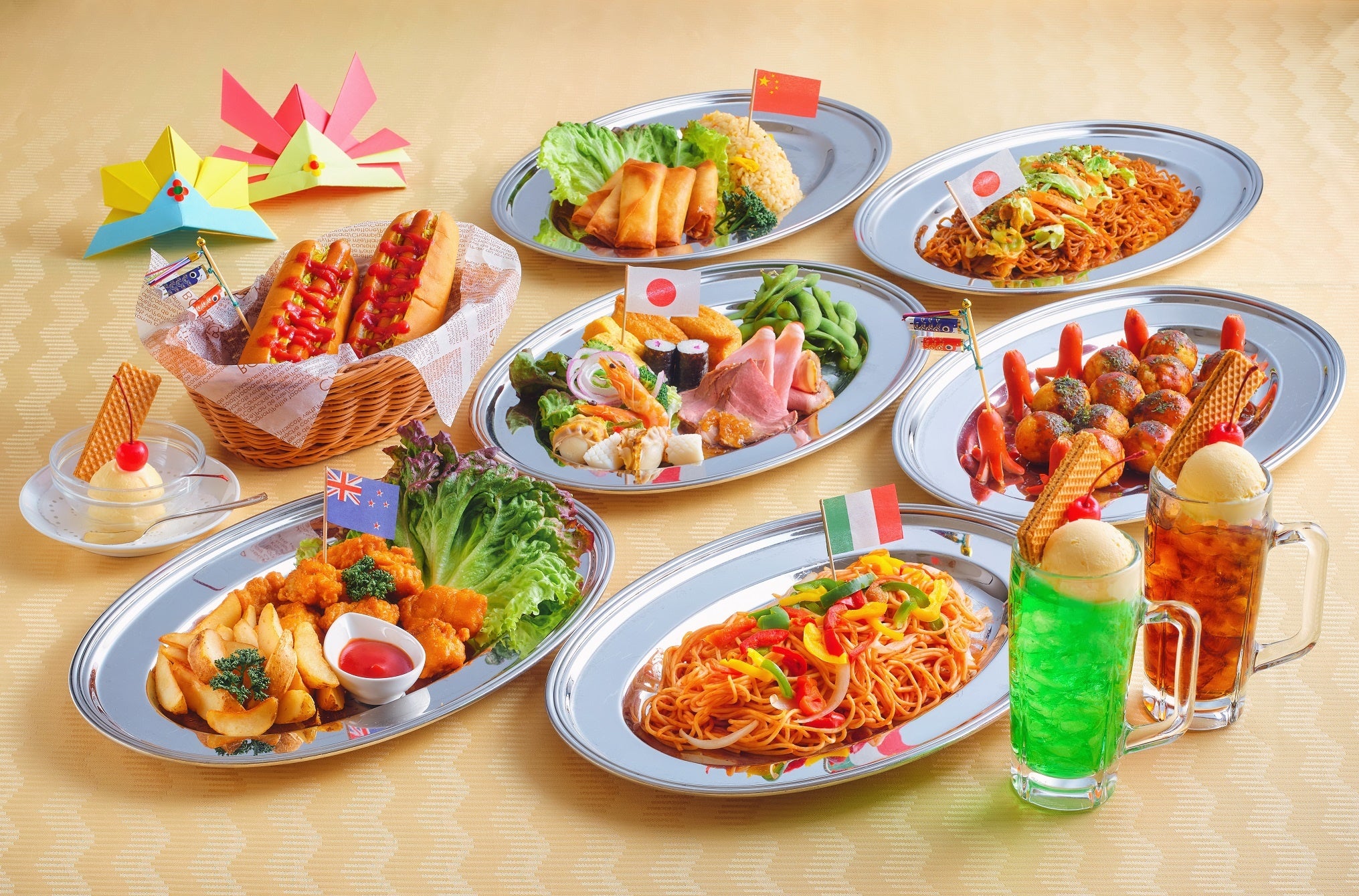 食べ放題メニュー(イタリアンスパゲティー/ 焼きそば / ホットドッグ / 海老フライ / たこ焼 / ポテトフライ / 炒飯 / 春巻き など)