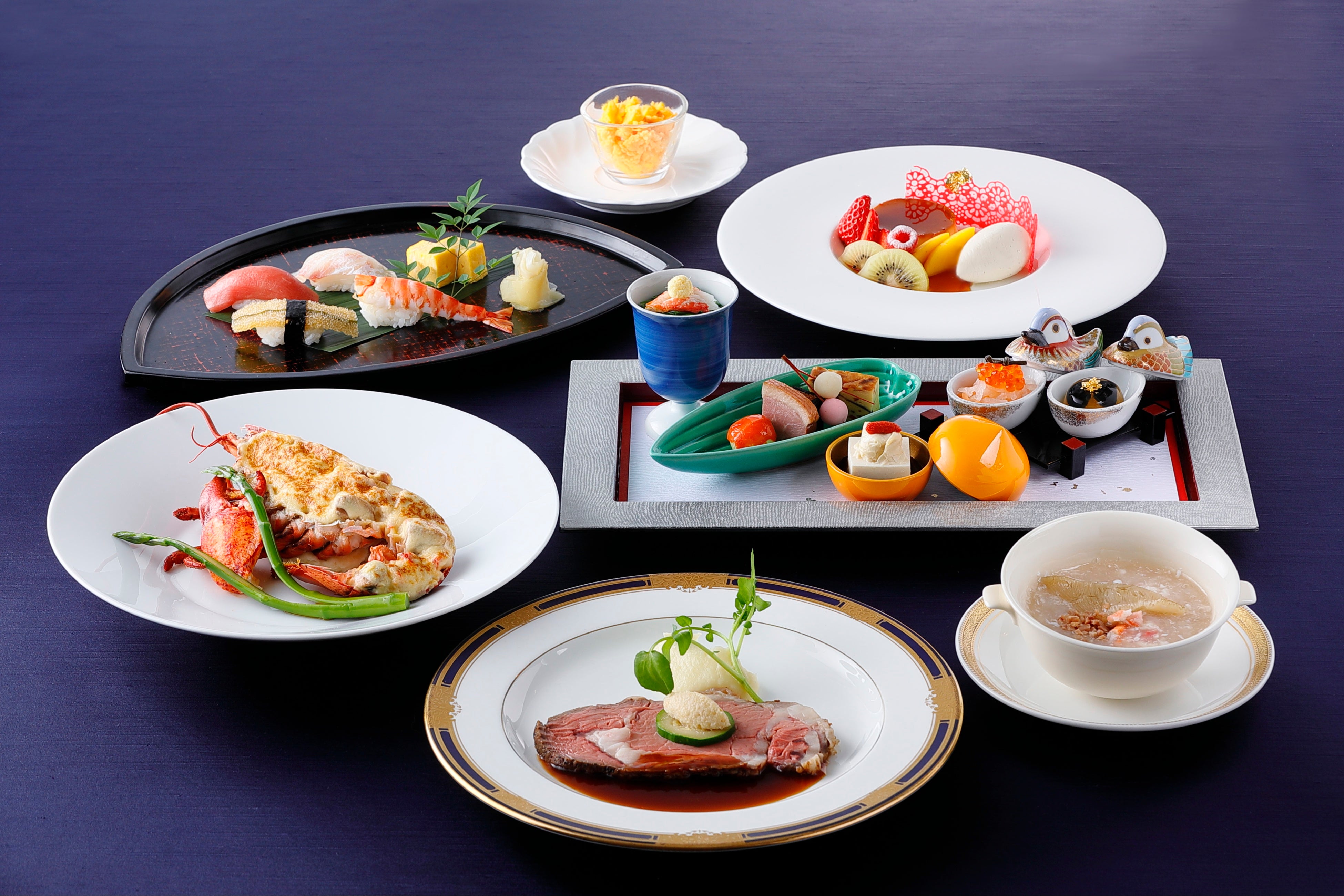 晴れやかな門出を祝う品々は、日本料理「なだ万」が手掛けた見た目でも愉しめる「祝肴」から始まります。紅白をイメージした“なます”や、縁起物とされる“黒豆”“結び昆布”など和の食材をふんだんに用い色鮮やかに仕上がっています。中国料理「南国酒家」の看板メニューである「ふかのひれスープ」は、様々な世代に愛される濃厚な旨味が凝縮された一品です。魚料理は、オマール海老の身に濃厚なホワイトソースをかけ焼き上げた料理で「テルミドール」と呼ばれる古典的なフランス料理の調理法で仕上げています。メインのお肉料理はローストビーフ。ホテル開業以来愛され続けている“モンマルトル伝統”のローストビーフを今回のメニューでは国産牛ロース肉でご用意いたしました。爽やかな辛みのレフォール(西洋わさび)と一緒にお召し上がりいただくのがおすすめです。“めでたい”の語呂から来る縁起物として“鯛”の「お寿司」や、卵の風味とほんのりとした甘さが特徴の正統派スイーツ「カスタードプリン」がさらにコースに花を添えます。