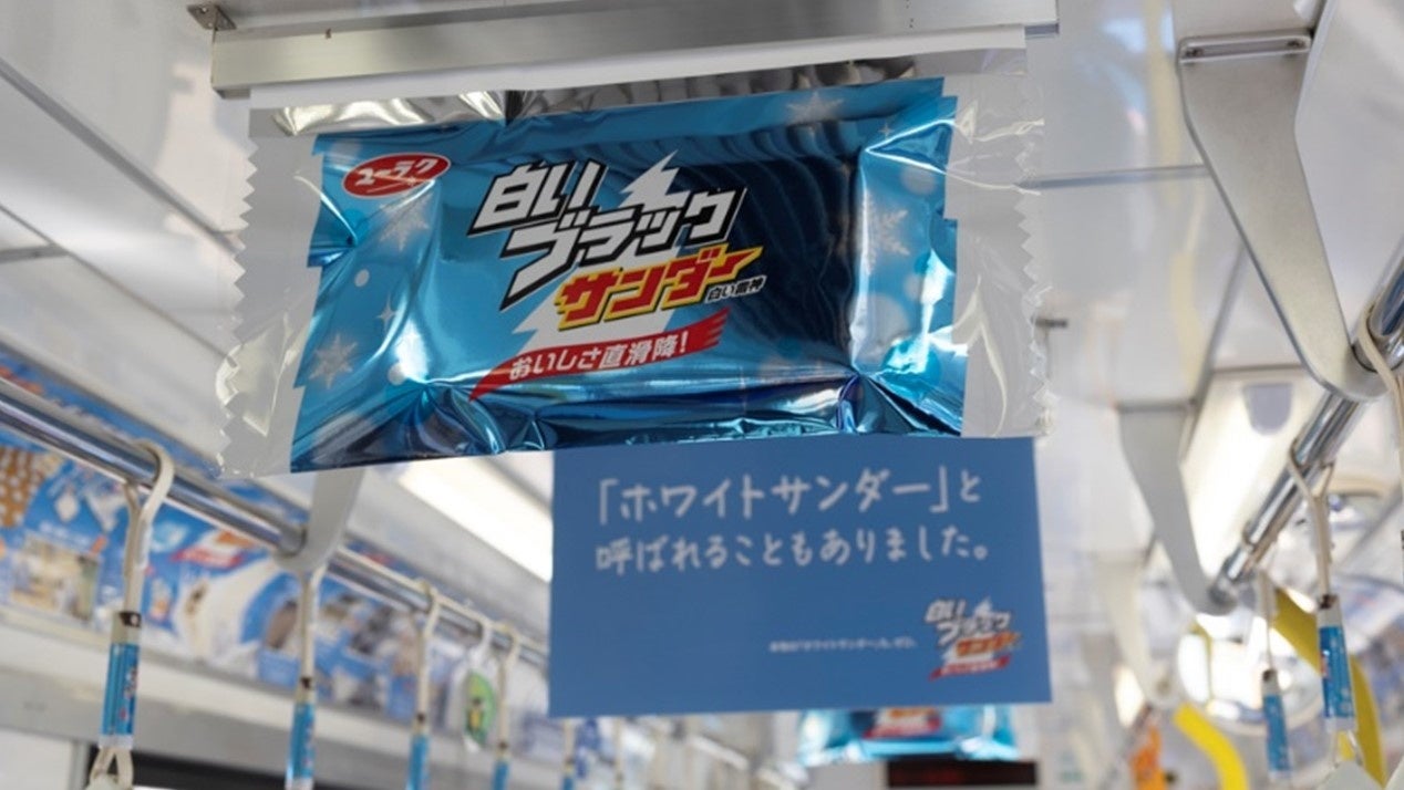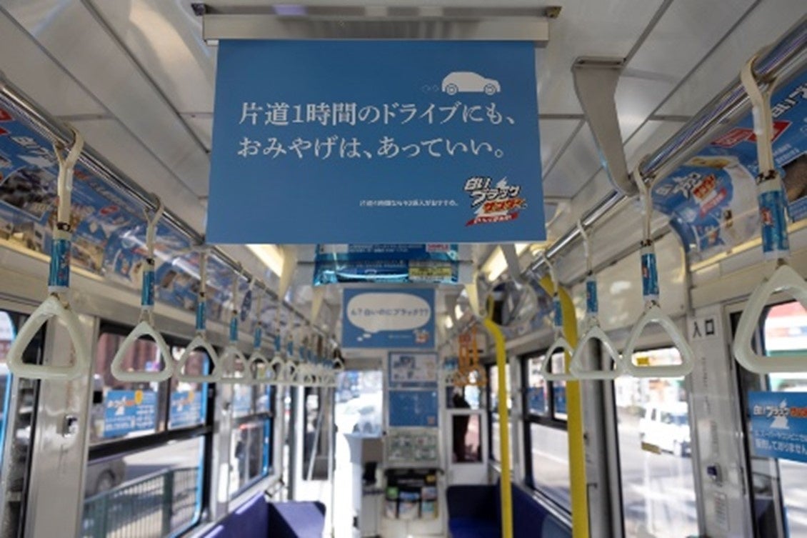 出発式では、発売10周年を迎えた北海道土産「白いブラックサンダー」の世界観を表現したラッピングが施された路面電車をお披露目しました。車体のラッピングだけでなく、つり革や窓など車内も白いブラックサンダーの世界観を表現し、装飾いたしました。また、より乗客の皆様に楽しんでいただけるよう、「白いブラックサンダー」の作り方レシピやプチ情報を掲載したポスターに加え、巨大な白いブラックサンダーが天井から吊り下がっているような仕掛けもご用意しております。