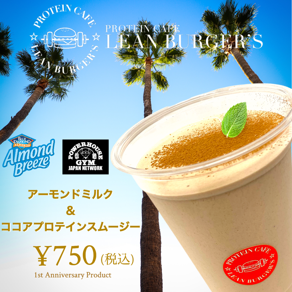 【アーモンドミルク&ココアプロテインスムージー】をLEAN BURGER’Sの1周年記念商品としてアーモンドミルクメーカーのブルーダイヤモンド アーモンド グロワーズ日本支社とオリジナルプロテインを販売しているPOWER HOUSE GYM®︎ JAPAN NETWORKとのコラボレーションにより2022年4月10日より発売致します。