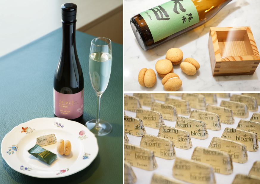 老舗のコラボレーション第2弾の当メニューは、天山酒造が手掛けるデザートと相性抜群のリエコーカルメに合わせた、天山酒造のスタンダード銘柄である七田の酒粕を使用した人気の焼き菓子バーチ・ディ・ダーマJunmaiと北イタリア伝統のチョコレート「ジャンドゥイヤ」、ライスクリスピーをビターチョコレートでコーティングしたチェレアリーノをペアリングしてご提供いたします。