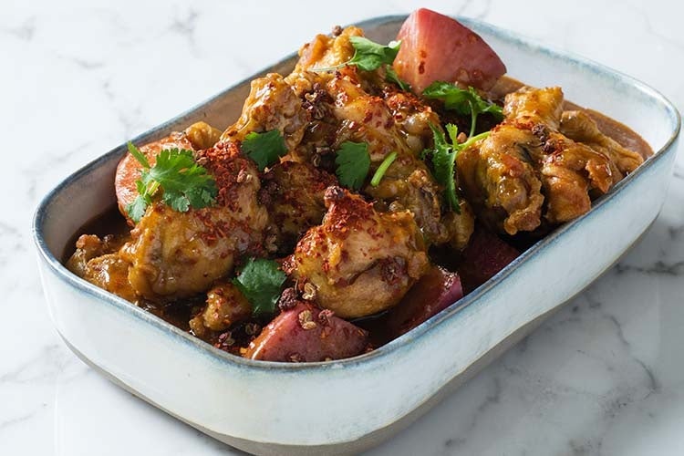 じっくり蒸した鶏手羽と、蒸してから芳ばしく焼き上げた紅芯大根を、麻辣ソースと合わせたピリ辛の煮込み料理。お肉はほろりと身離れもよく、常温でも温め直してもジューシーになるよう仕上げました。散らしたパクチーもアクセント。