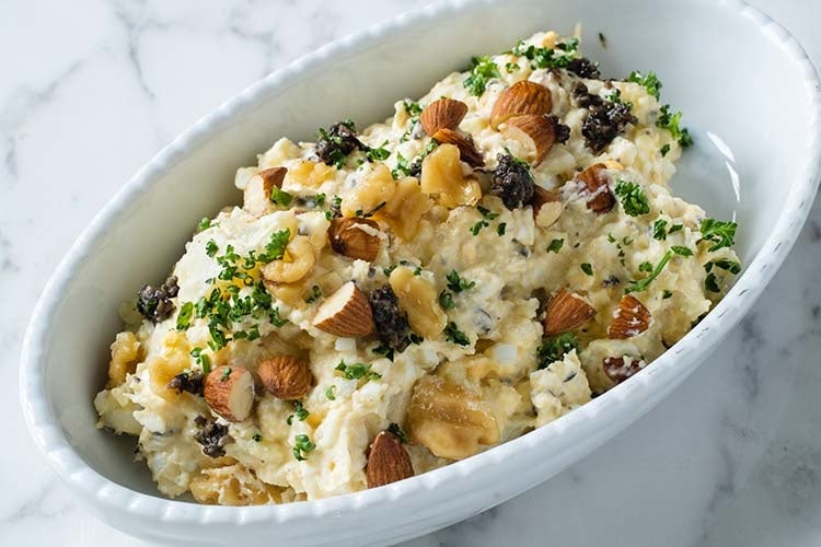 蒸したキタアカリを、茹で卵、マヨネーズと和え、仕上げにトリュフオイルを加えたリッチなポテトサラダです。ざく切りのアーモンド、クルミ、ブラックオリーブ、刻みパセリが食感と風味にアクセントを加えます。